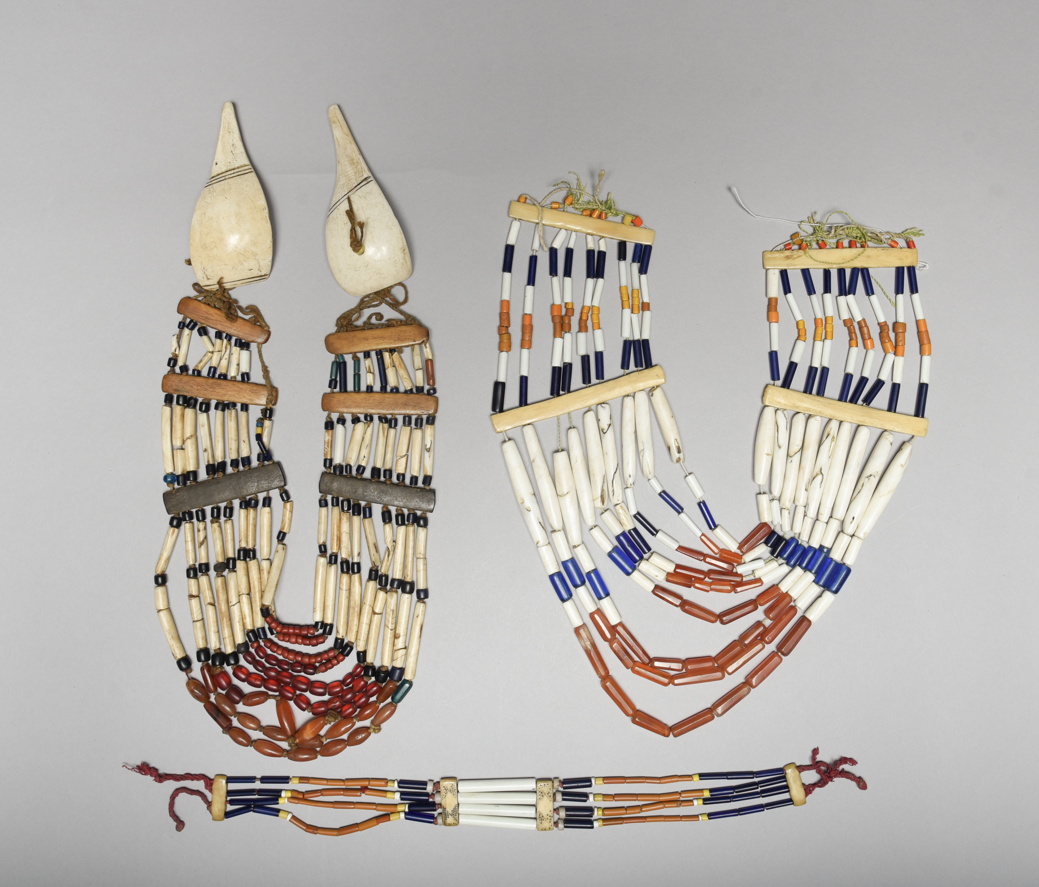 shell, coloured glass beads, fibre and bone spacers, two with carnelian beads and one with incised dot and linear decoration to two of the bone spacers,