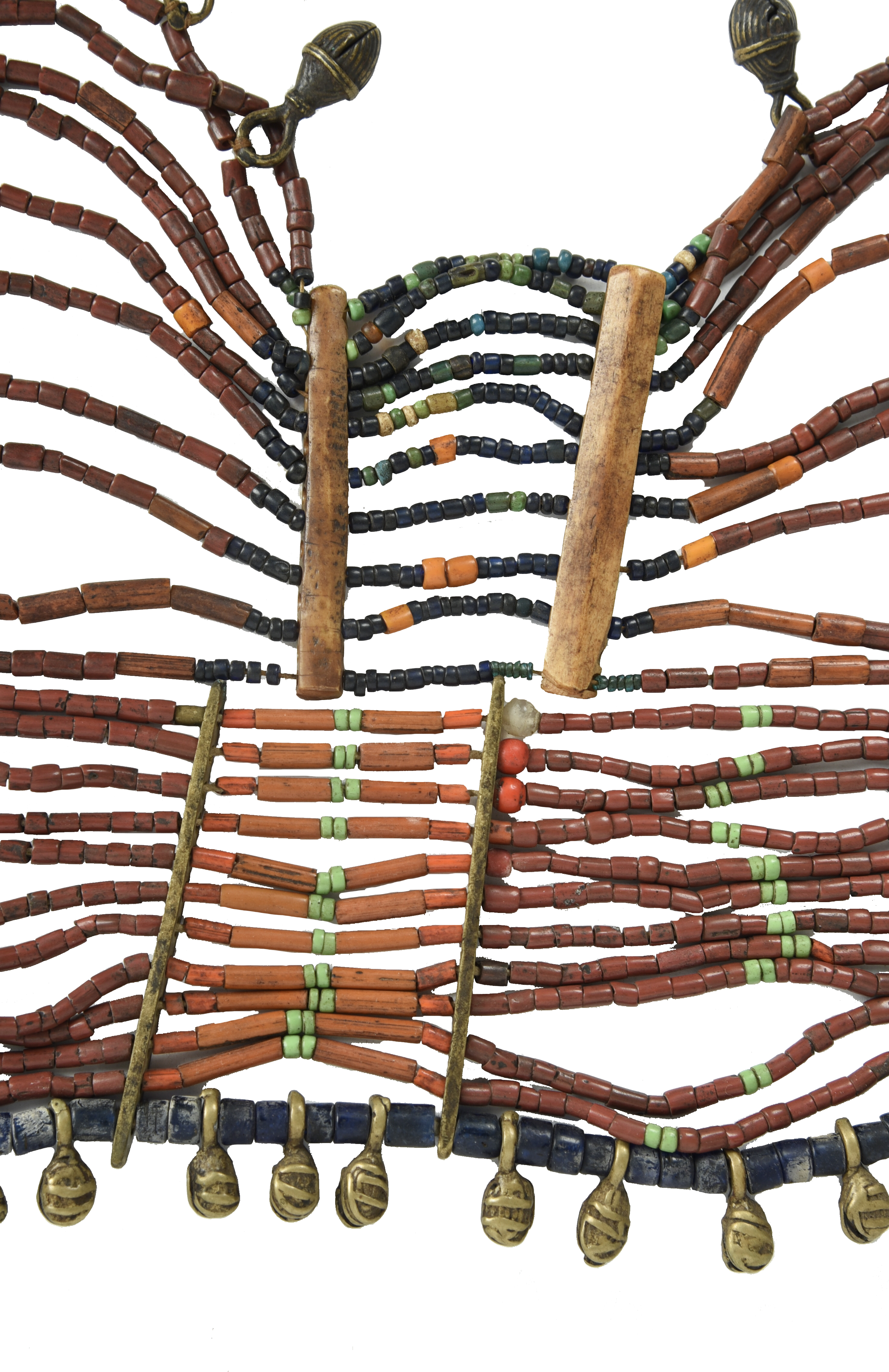 coloured glass beads, fibre, shell and brass bell pendants, one with bone spacers, 35cm long, and the other with brass spacers, 27cm long. (2)