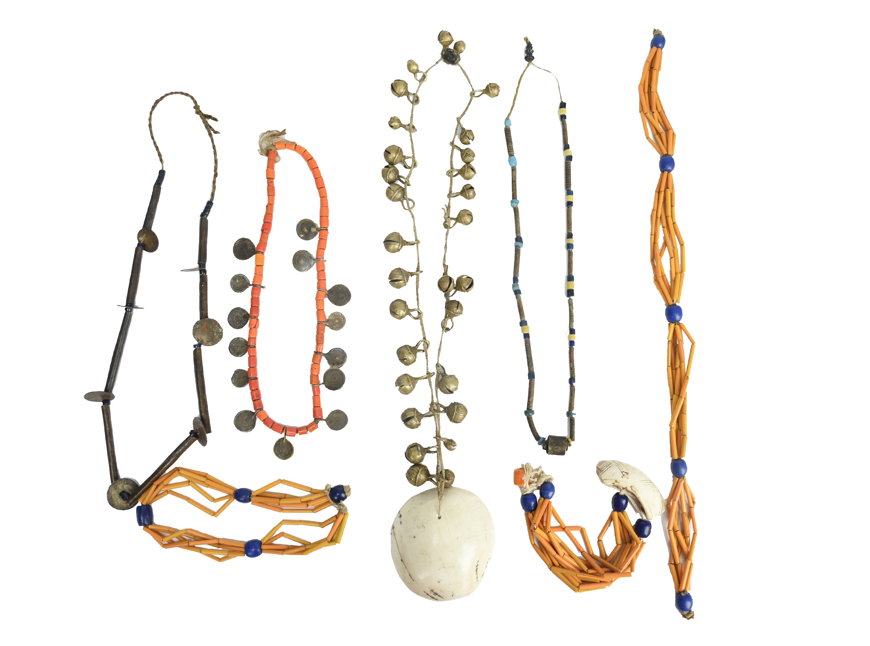 including three Ao, with orange and blue glass beads, one with a shell pendant, 21cm, 41cm and 49.5cm long, another Sangtam with brass bells and a shell pendant, 47cm long, an orange glass bead and brass spiral disc pendant necklace, probably Burmese Naga, 27cm long and two with metal tubes, having either coins or glass beads, 35cm and 38cm long. (7)