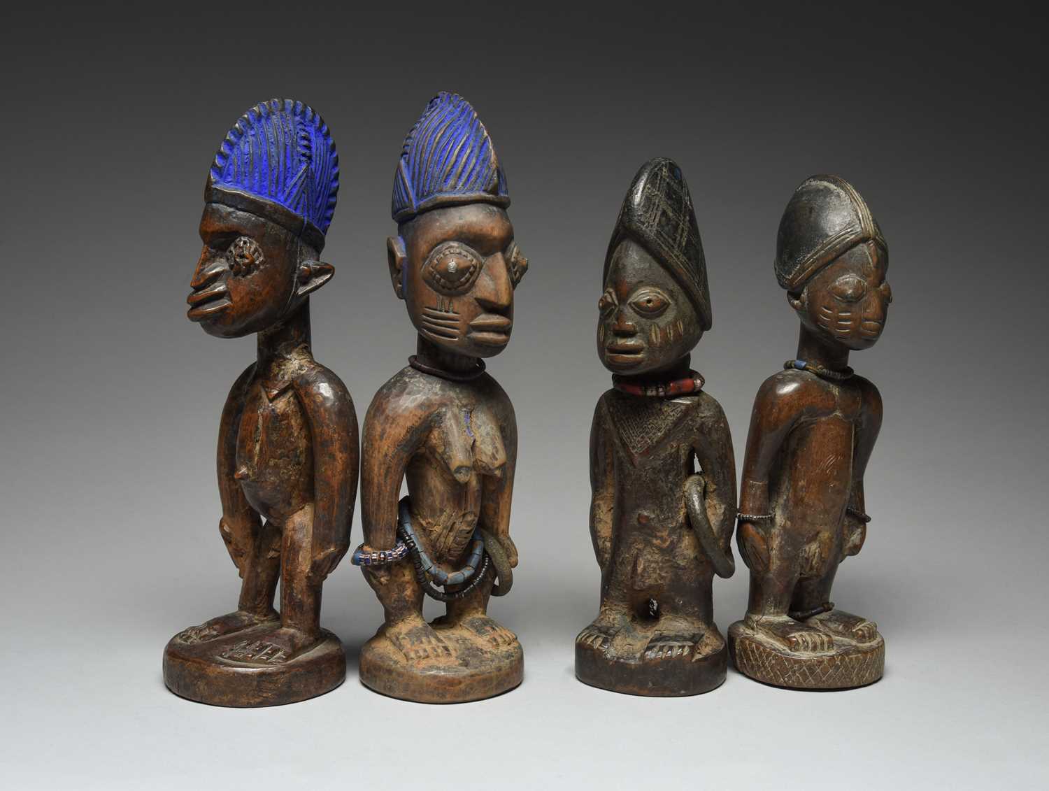 including three males, one with an Islamic tirah neck amulet and wearing glass beads and a metal band, and a female wearing beads and a band,