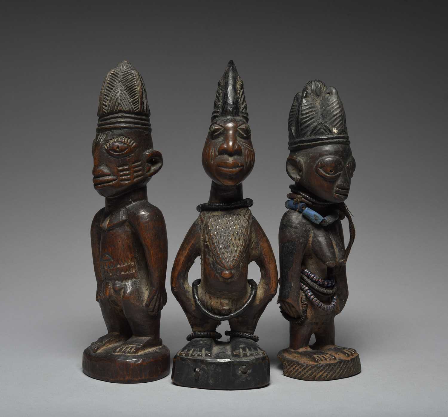 including two males, one with large diaper decorated neck amulets, metal pins eyes and beads, and a female, with beads,
