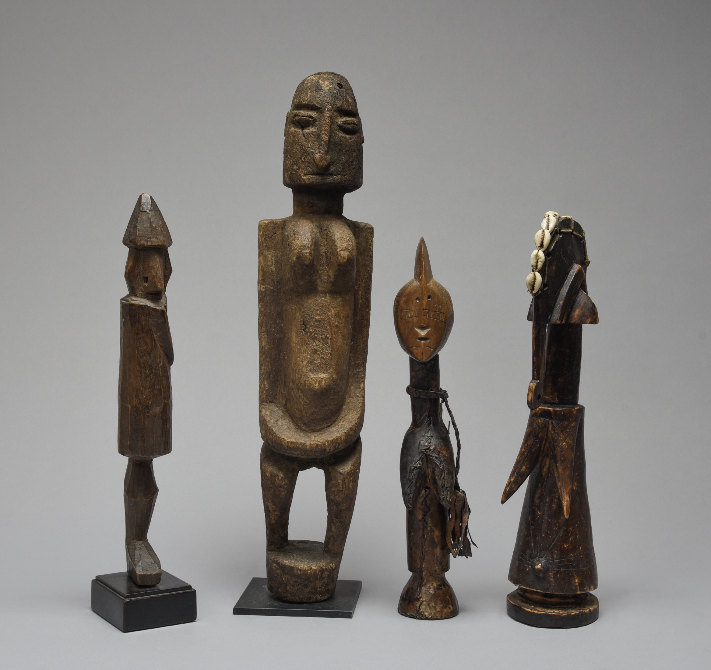 including two Mossi dolls, one with a leather covered body and with applied shells to the crest, 32.3cm and 34.5cm high, a Yaka figure, 32.8cm high, on a base and a Dogon figure, 45.5cm high, on a metal base. (6)
