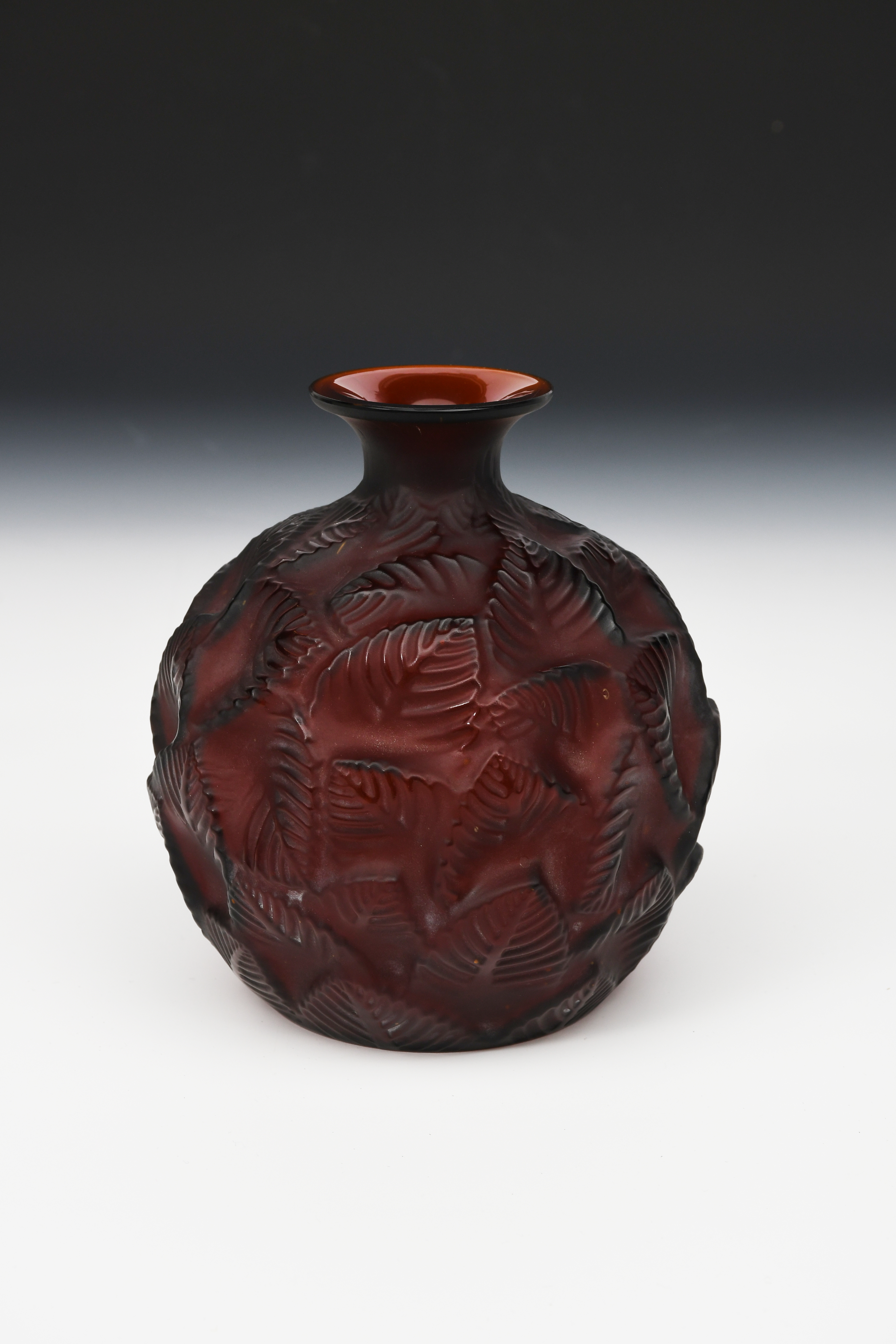 'Ormeaux' no 984 a red clear and frosted glass vase designed by Rene Lalique, moulded in relief, stencilled R Lalique France No 984, 16.5cm. high