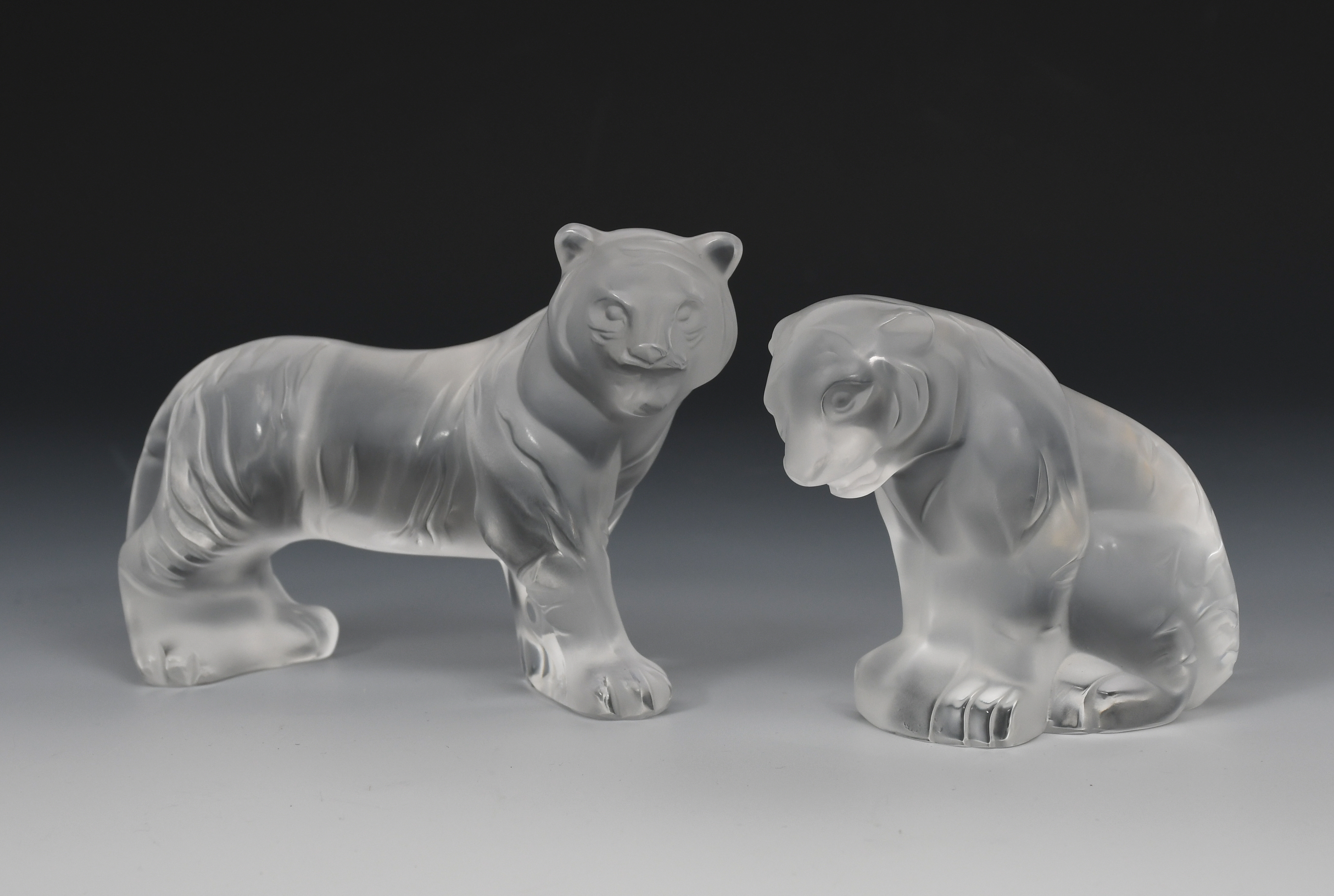 'Bengal Tiger' and 'Bengal Tiger Seated' two modern Lalique clear and frosted glass figures, both etched Lalique France, 8.5cm. high (2)