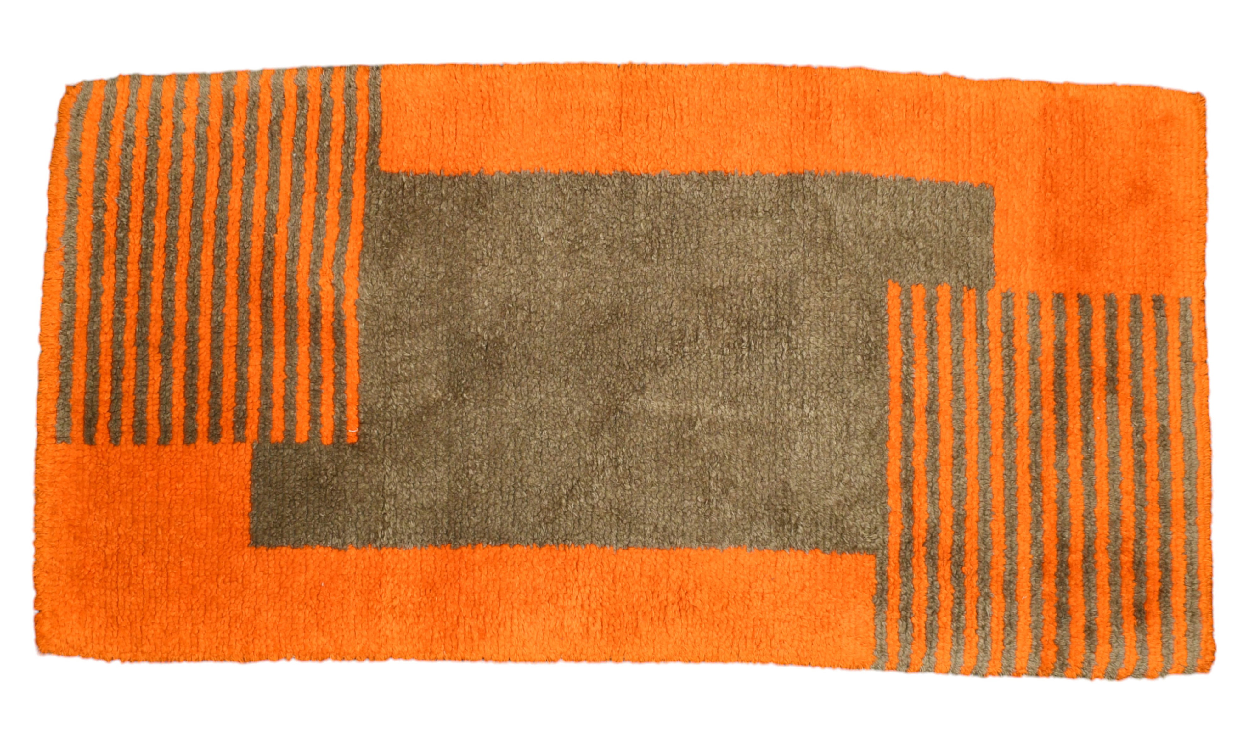 An Art Deco English Modernist wool rug, rectangular, vivid orange ground with chestnut geometric panels, unsigned, 137 x 69cm.