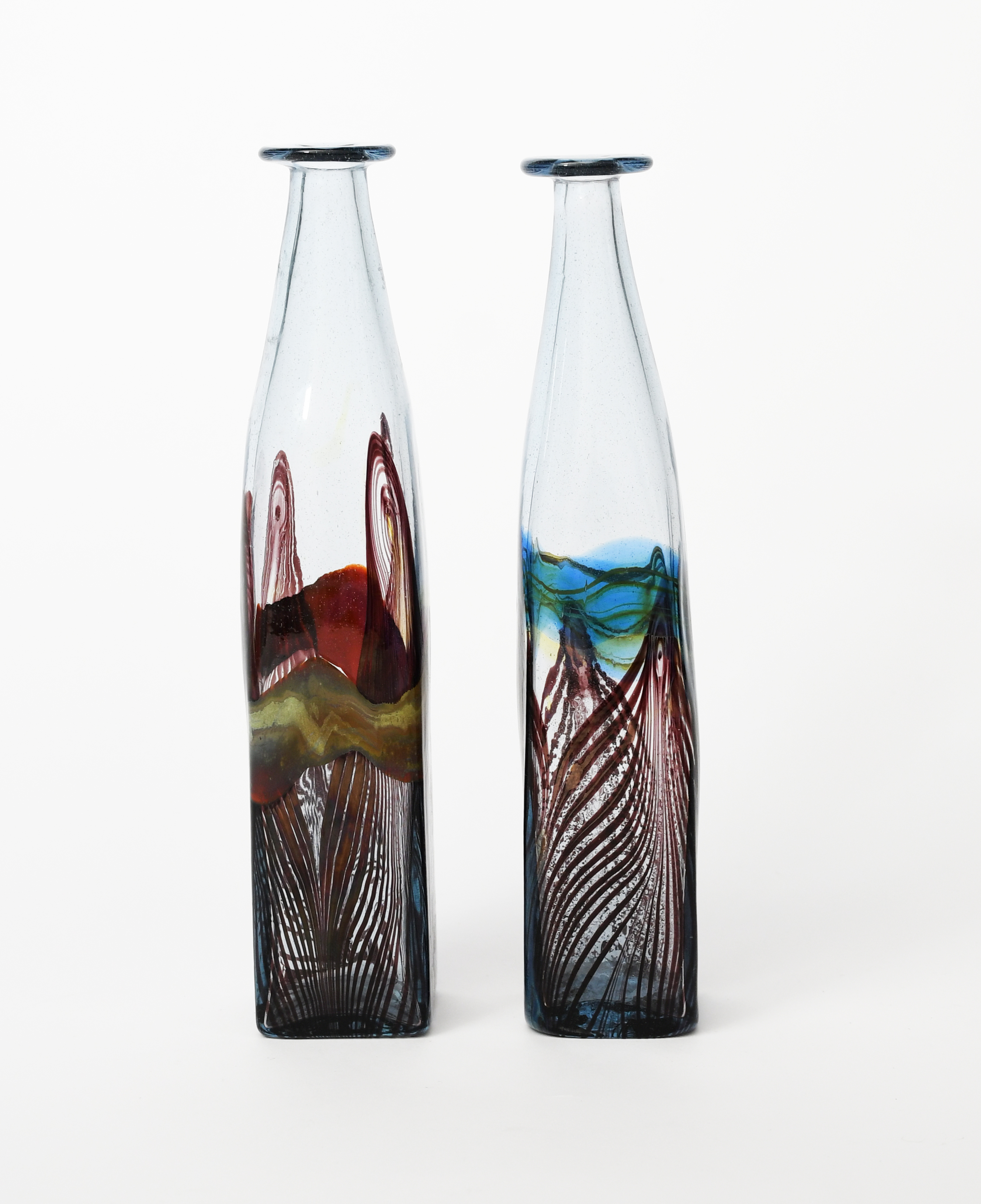 square section body with tapering neck and everted circular disc rim, pale blue glass internally decorated with combed aubergine from the foot, each with irregular horizontal band with splashes of colour,