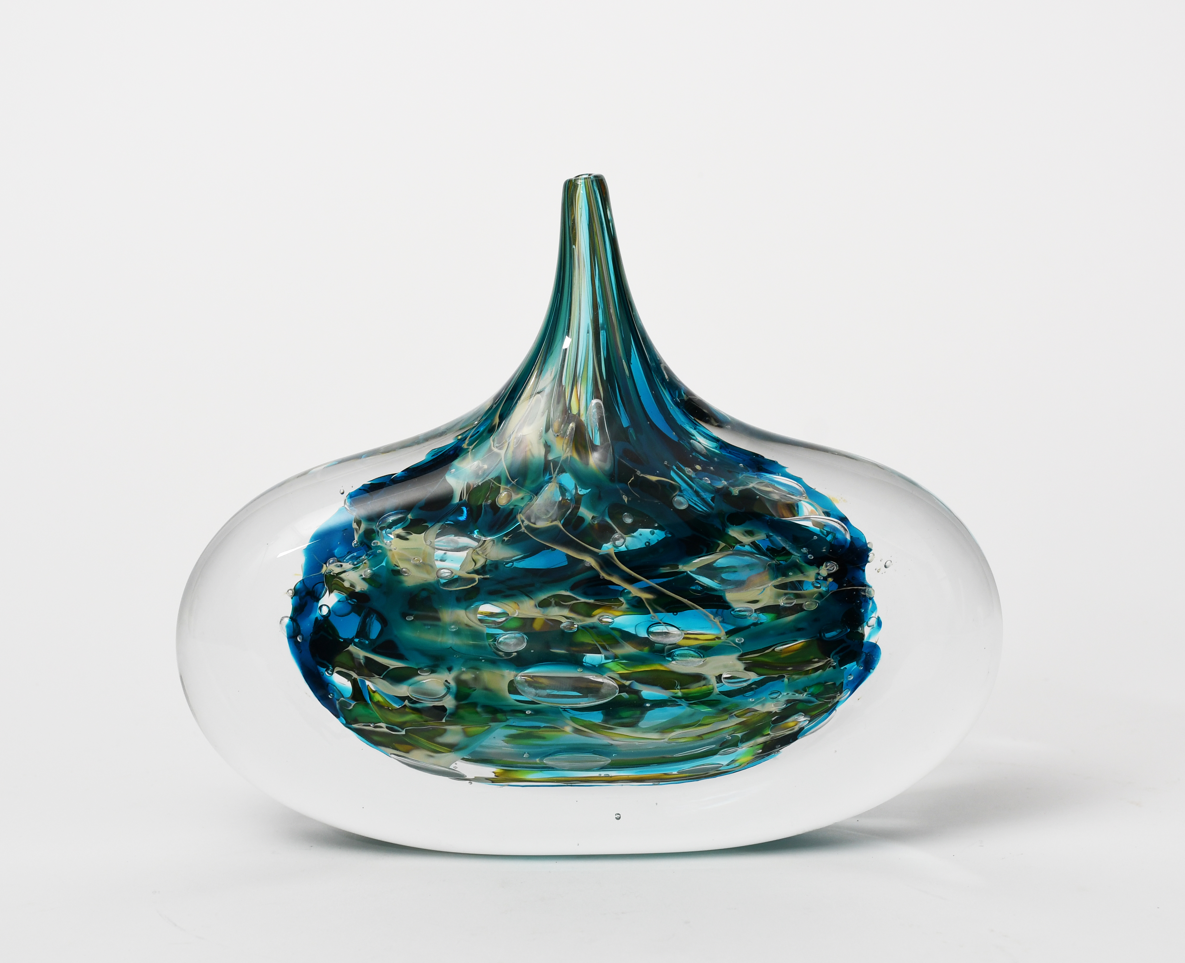 Φ A Contemporary Isle of Wight glass Crizzle Stone vase by Timothy Harris, dated 2008, blue and white patches cased in clear with pulled solifleur neck, etched marks, 25cm. wide