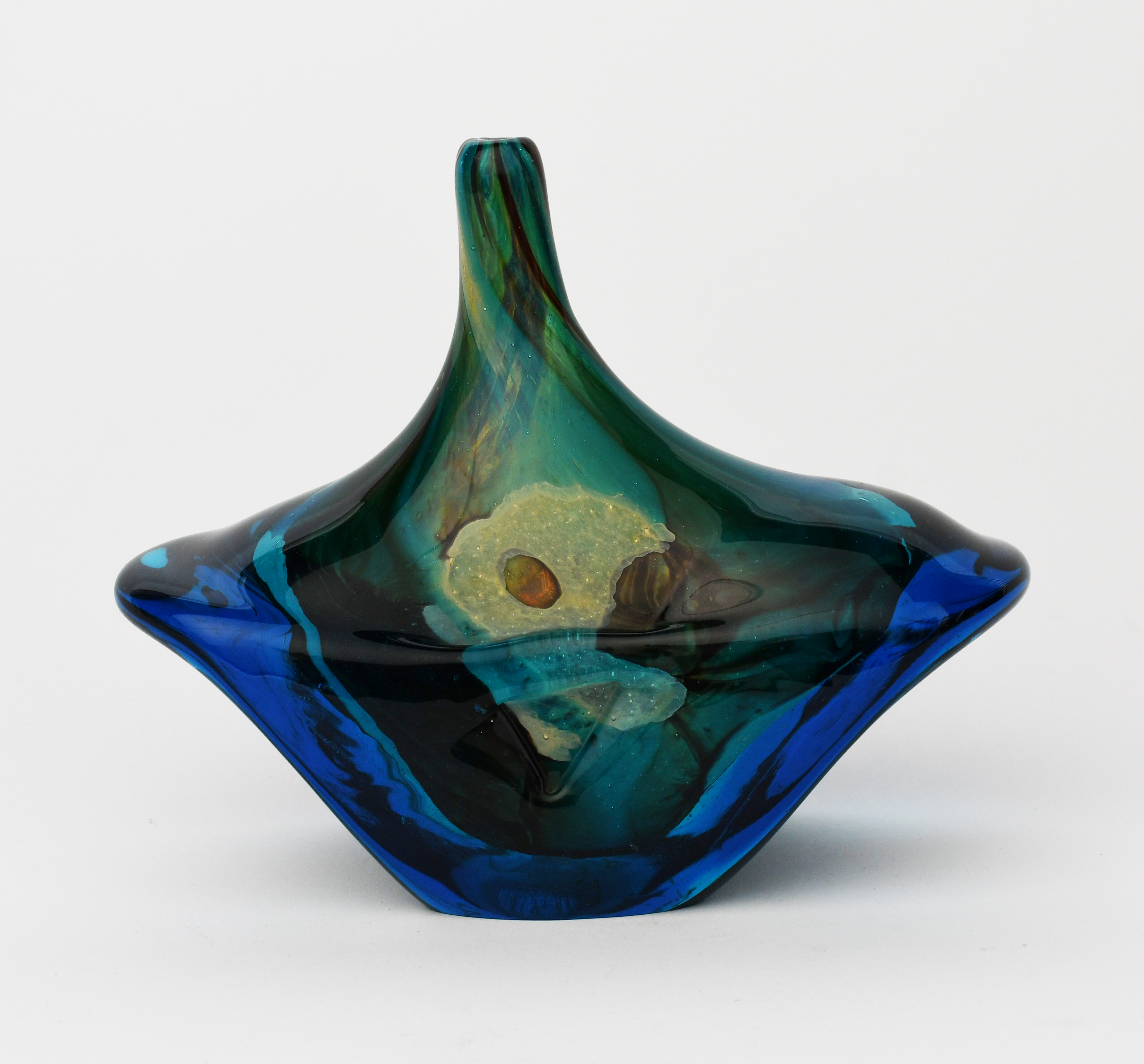 Φ An unusual small Mdina Glass Fish vase probably designed by Michael Harris, mushroom, green and blue, cased in thick blue glass, unsigned, 16cm. high