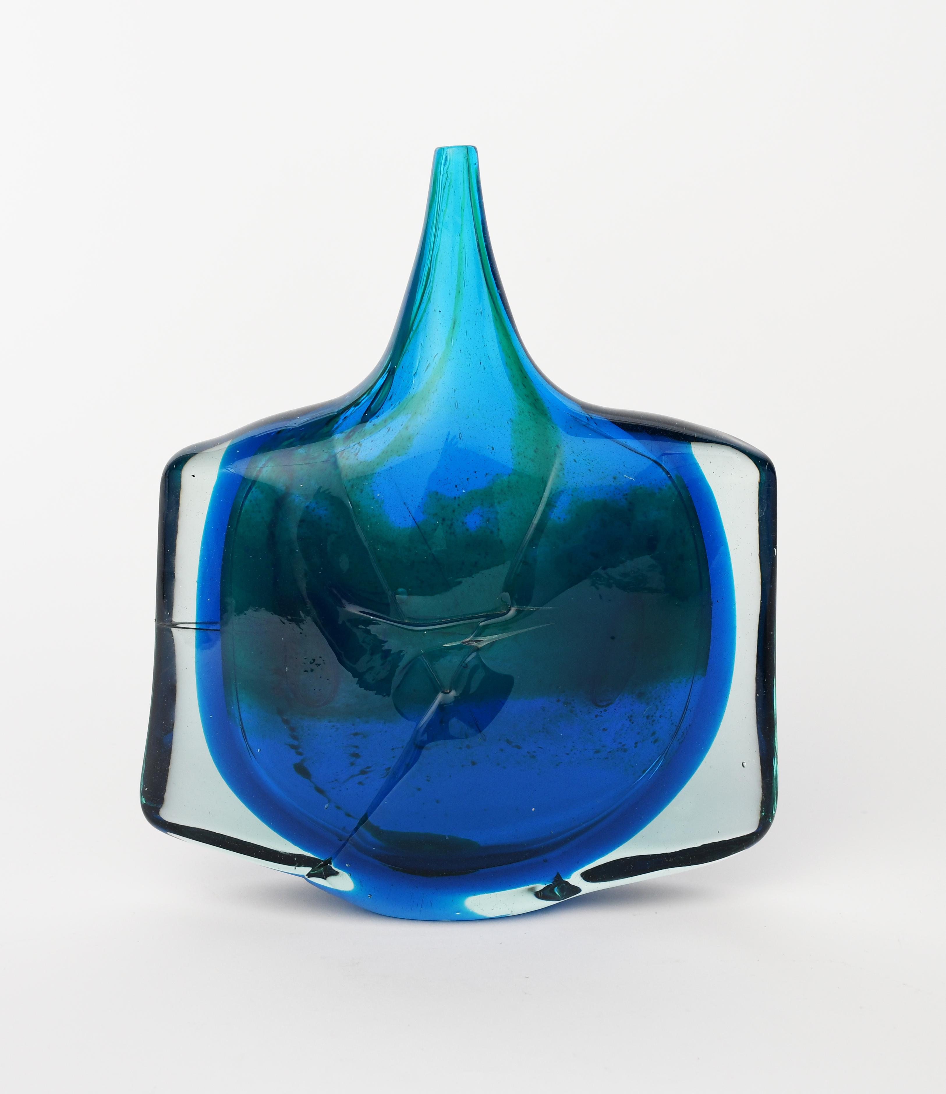 Φ A large Mdina Glass Fish vase designed by Michael Harris, streaked blue and green, cased in blue glass all cased in clear unsigned, 28.5cm. high