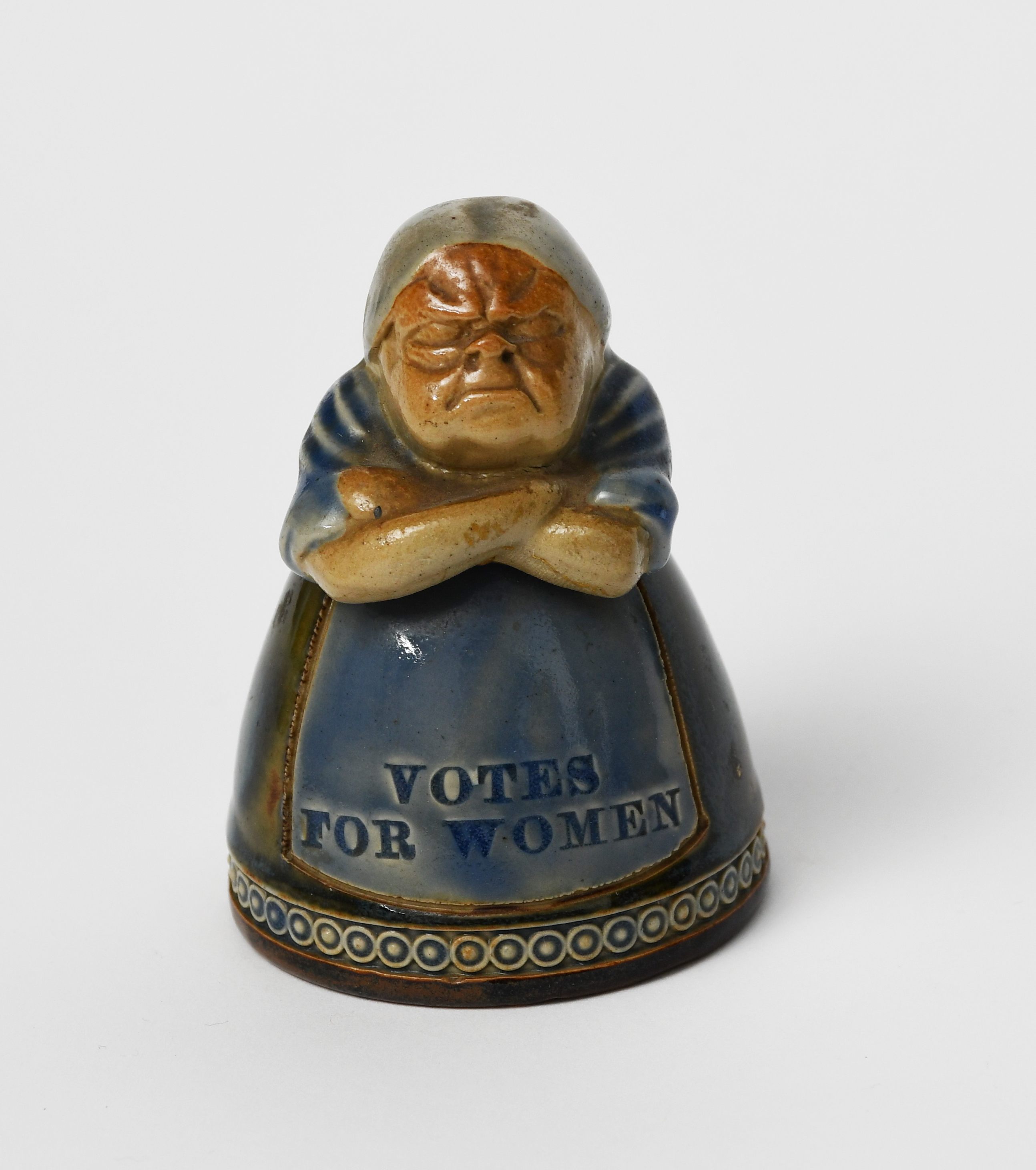 A Royal Doulton Suffragette stoneware inkwell, modelled as an old lady with arms crossed and angry face, her apron stamped Votes for Women, glazed in colours impressed factory marks, hinge broken, cover glued to base, 8.5cm. high