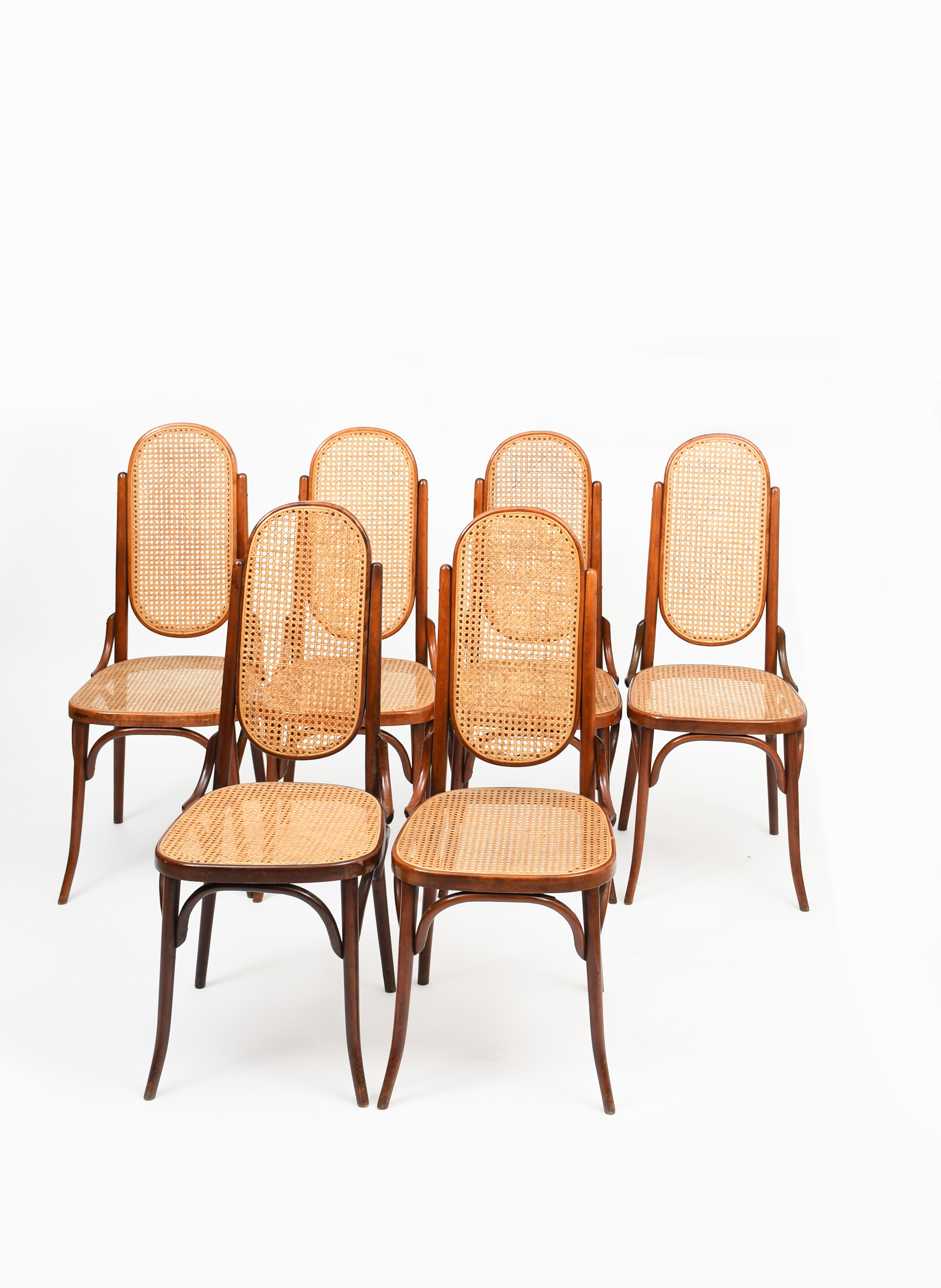 A set of six bentwood chairs in the manner of Thonet, with cane backs and seats,