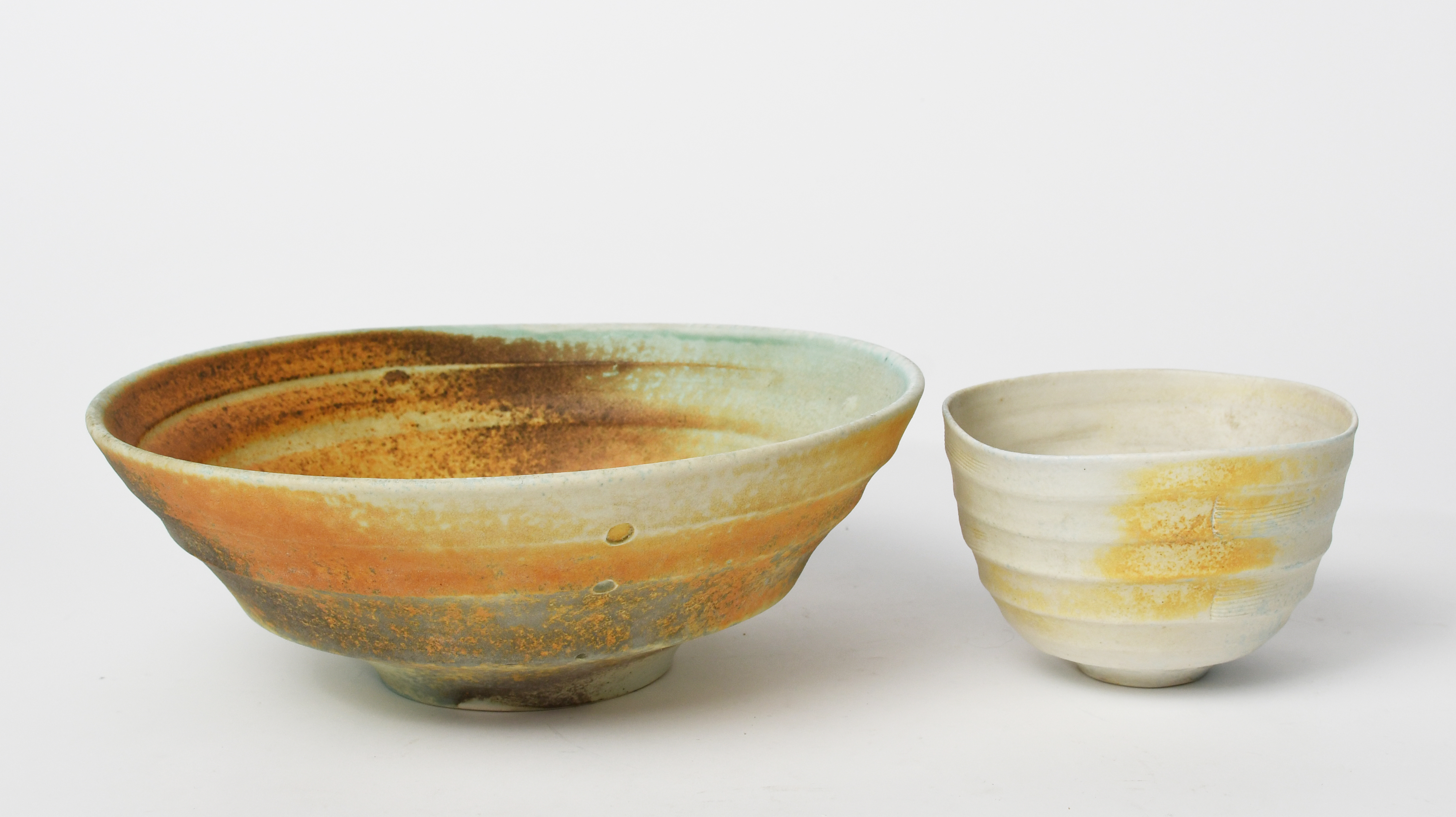 porcelain, flaring, conical form with impressed decoration, with soda vapour glaze, and another square section bowl