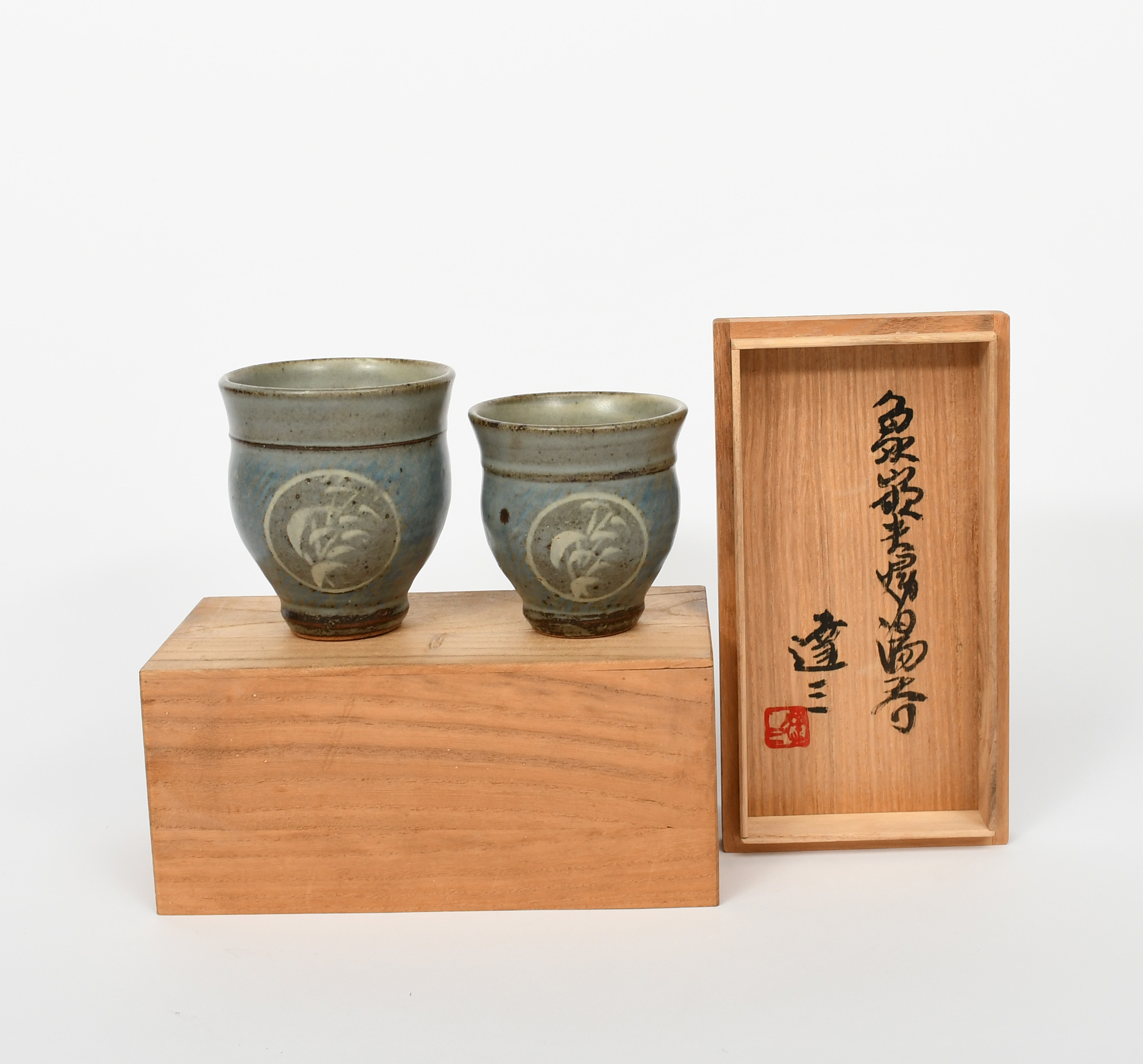 stoneware, painted with simple leaf roundel in celadon grey on a pale blue ground, in signed and fitted wooden box,