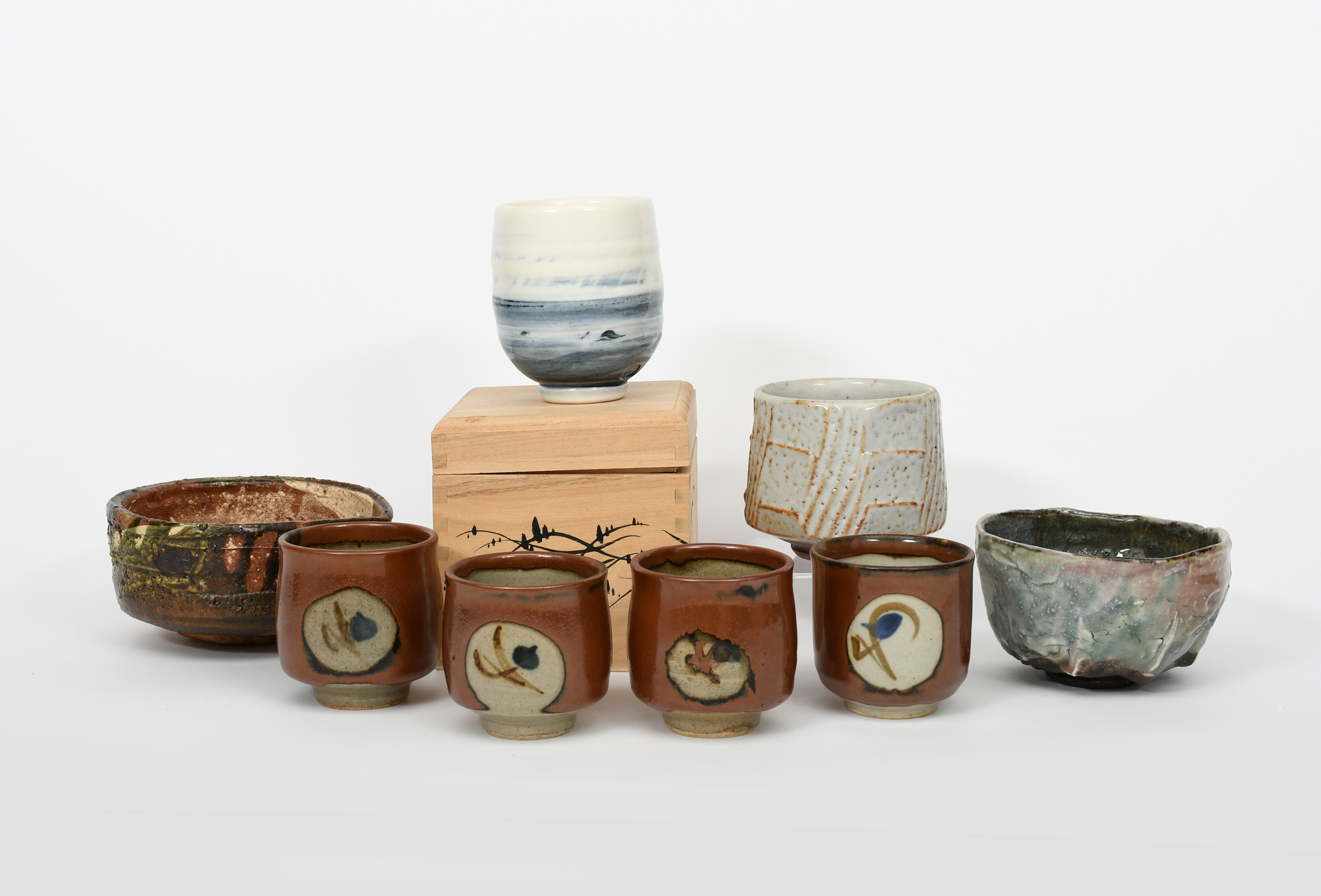 footed form, covered in a rust glaze over ash, with simple mon design, a stoneware unomi by Margarit Curtis and three other tea bowls,
