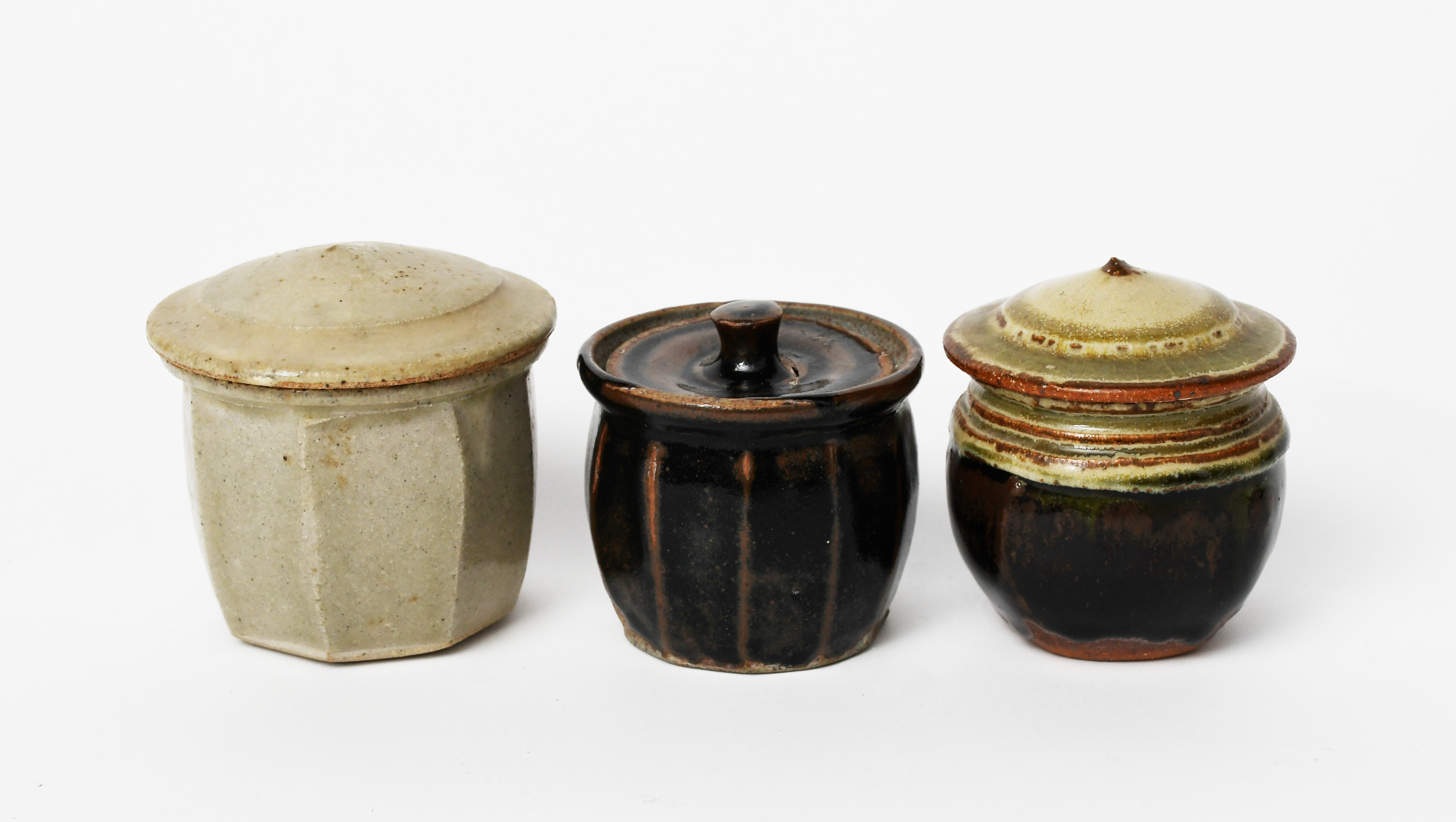stoneware covered in an ash glaze with dark iron, a cut-sided stoneware pot and cover and another by Richard Batterham