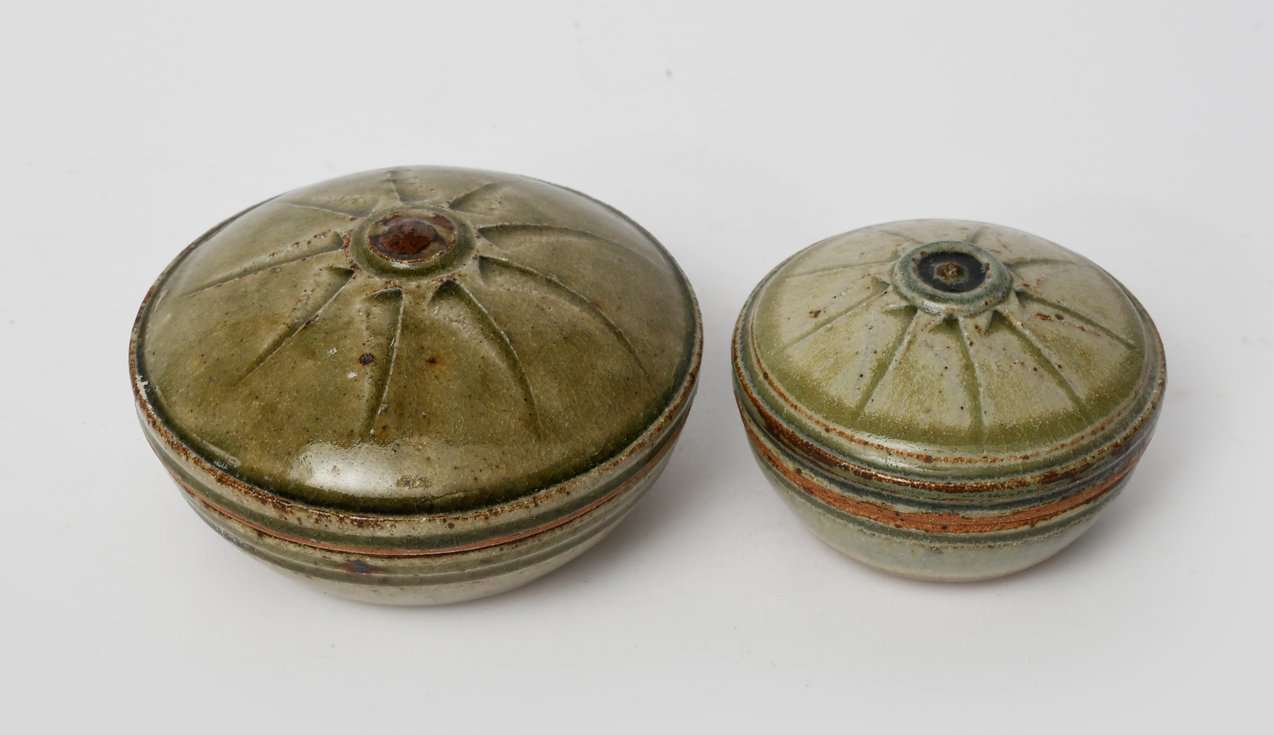 stoneware, the cover with star motif, covered in an ash glaze, and another smaller by Richard Batterham