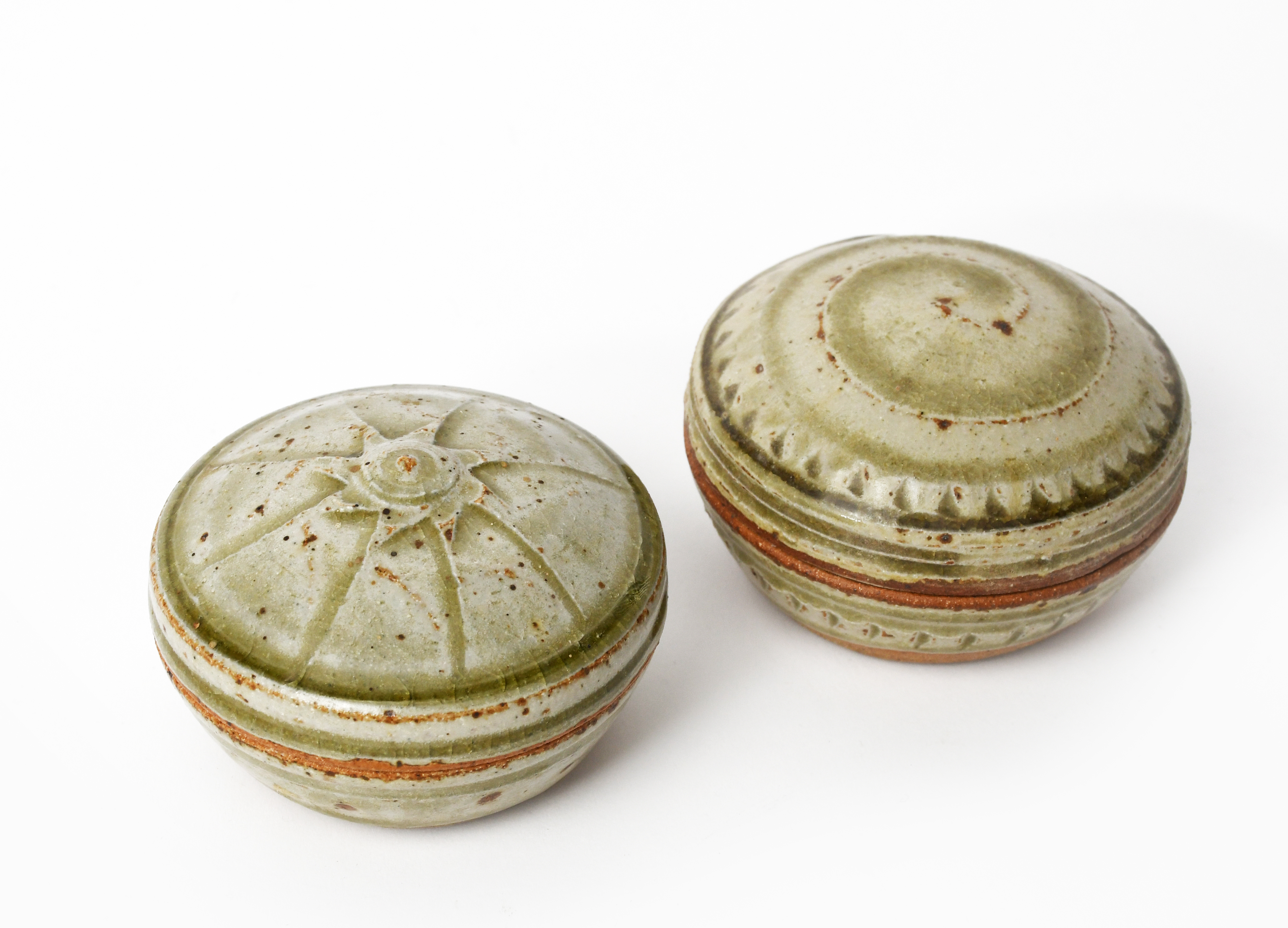stoneware with chatter band, glazed ash, and another similar by Richard Batterham