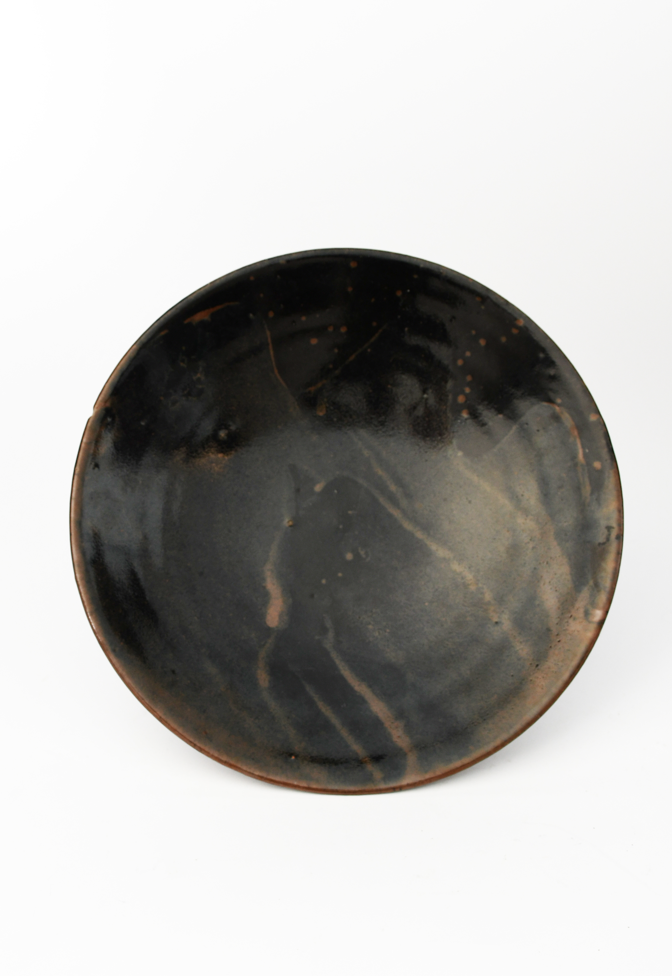 a stoneware charger resist decorated with a ghostly figure, in tenmoku,