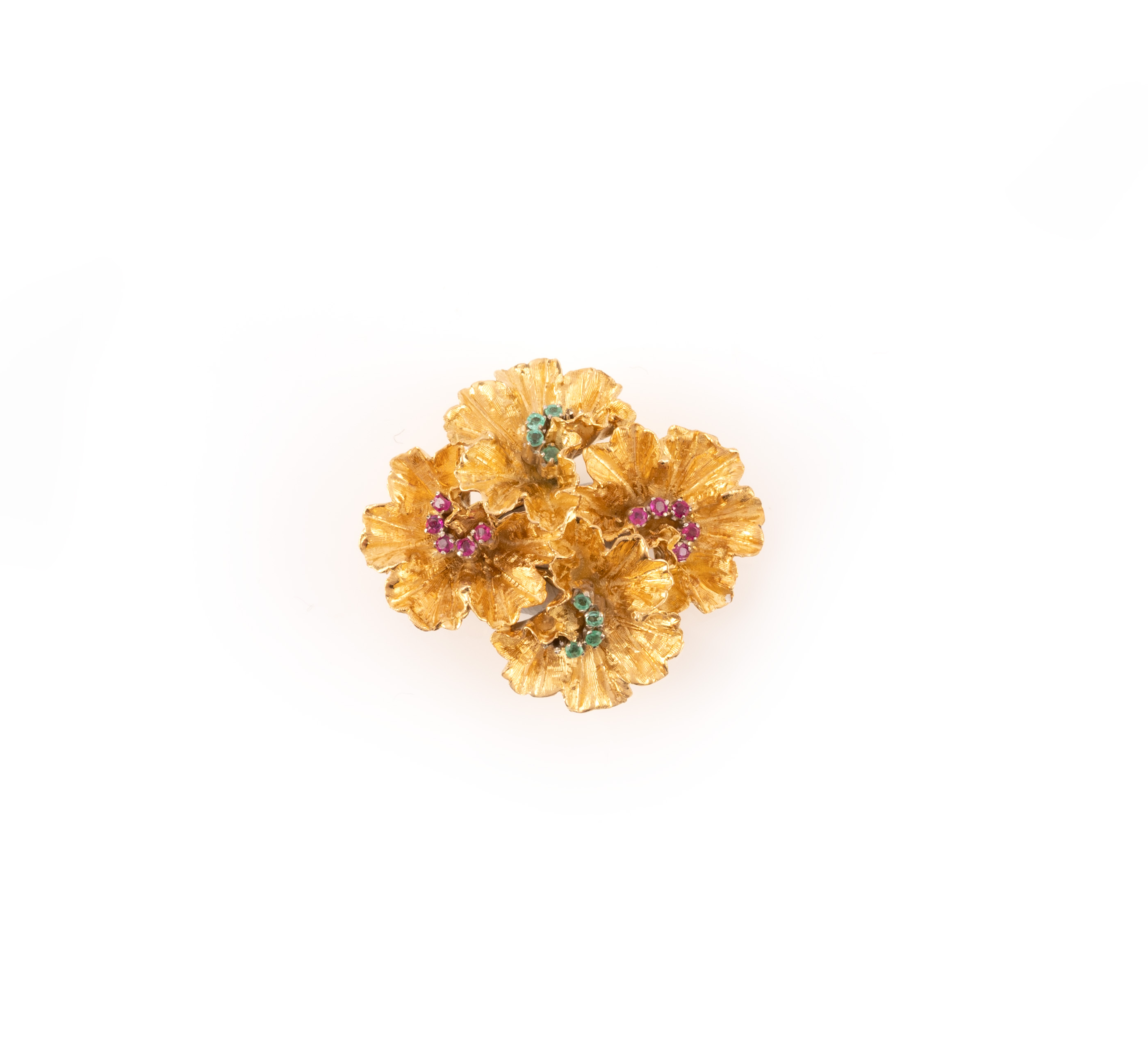A gold, emerald and ruby brooch, Italy, 1970s, designed as four abstract flowers in textured gold, set with circular-cut rubies and emeralds, length 3.7cm, Italian maker's marks, stamped 750, 2 emeralds missing, gross weight 13 grams