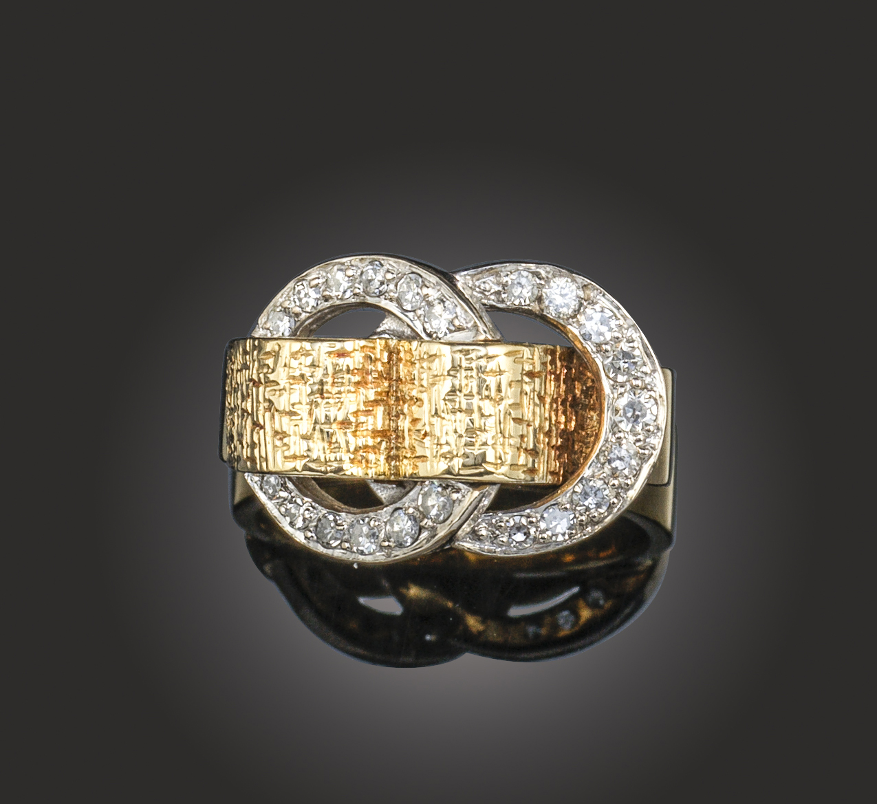 Ben Rosenfeld, a diamond ring, 1971, of buckle design, the two white gold disk set with graduating round brilliant-cut diamonds and tied by textured 18ct yellow gold straps to a wide shank, signed BRLd, London hallmarks, date letter for 1971, size approx L