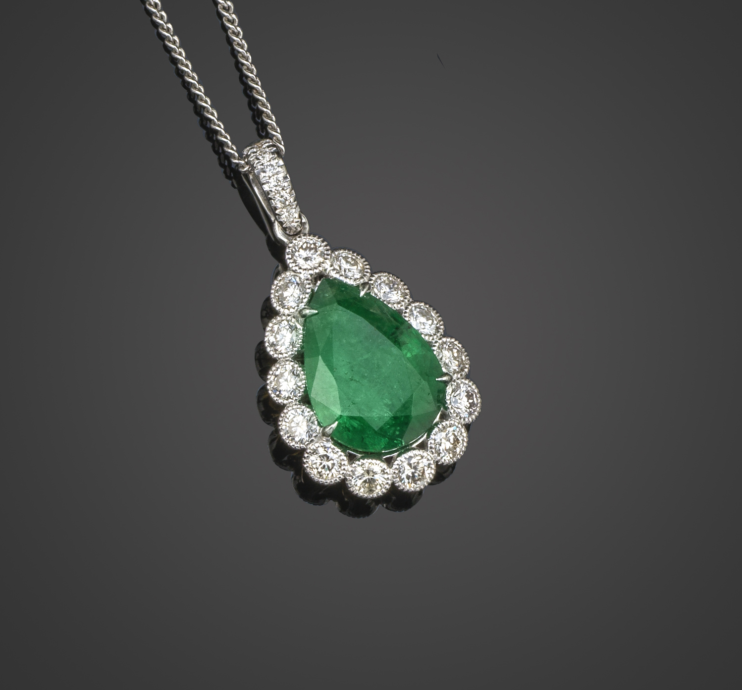 An emerald and diamond pendant necklace, the pear-shaped emerald in a surround of millegrain-set round brilliant-cut diamonds in white and yellow gold, to a fine link silver chain, pendant length 2.5cm, chain length 44cm, case