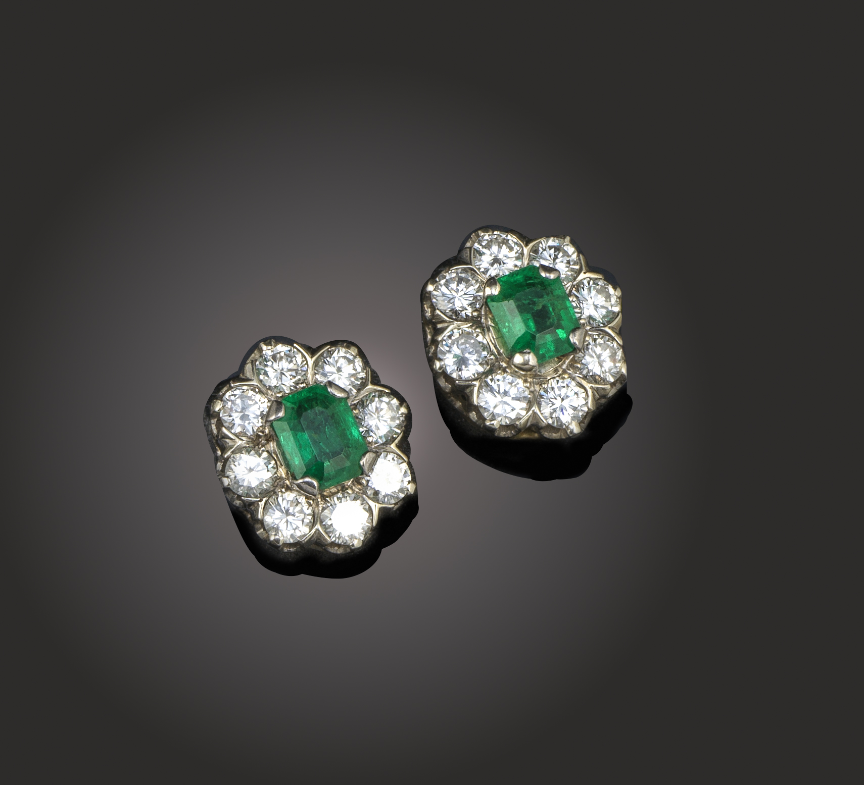 A pair of emerald and diamond cluster earrings, set with emerald-cut emeralds within a surround of diamonds in white gold, screw post fittings, length 13mm