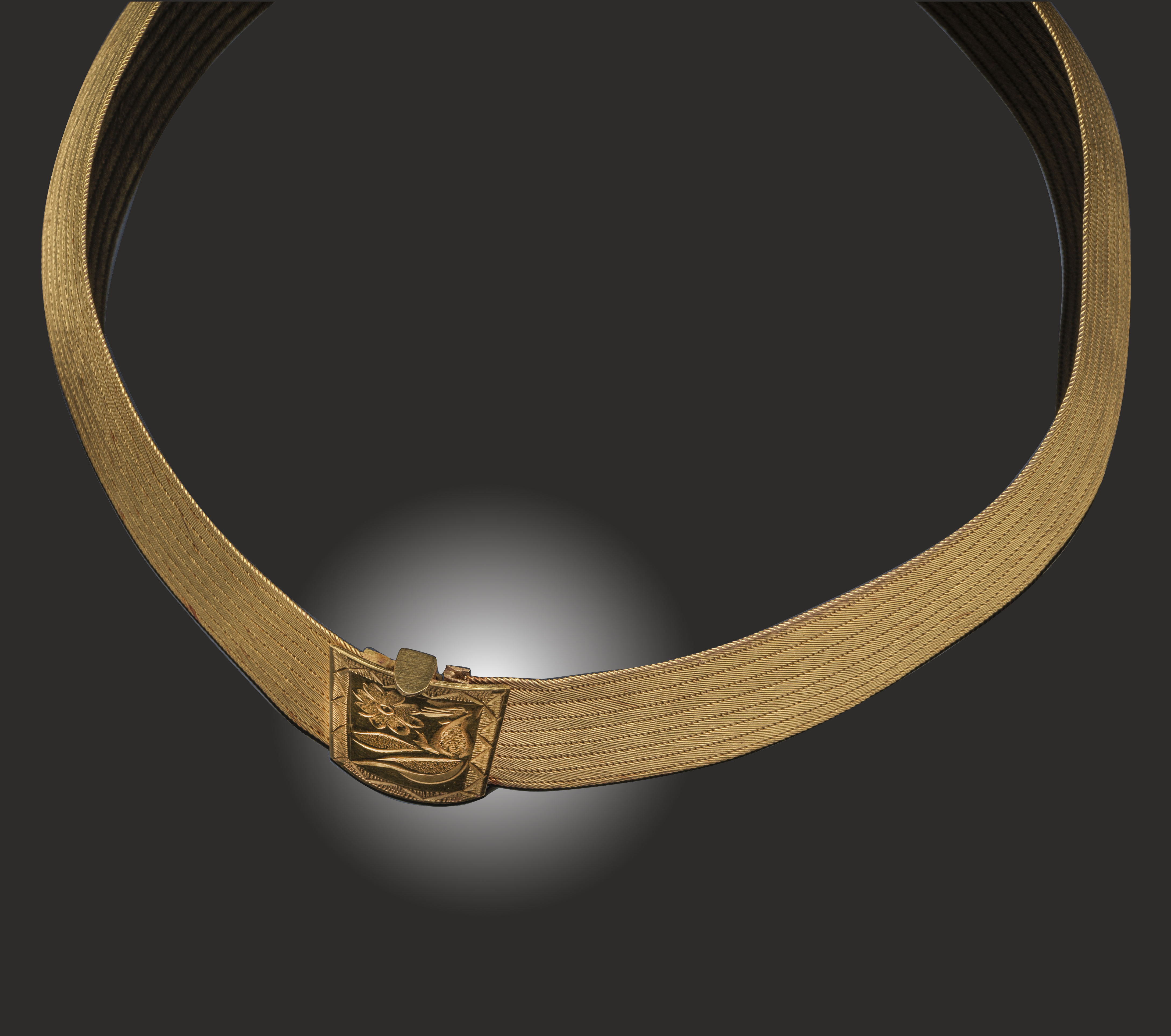 A gold choker necklace, the finely woven mesh necklace to a wide clasp chased with a floral motif, gold tests as 22cts, gross weight 71g, inner circumference 34cm