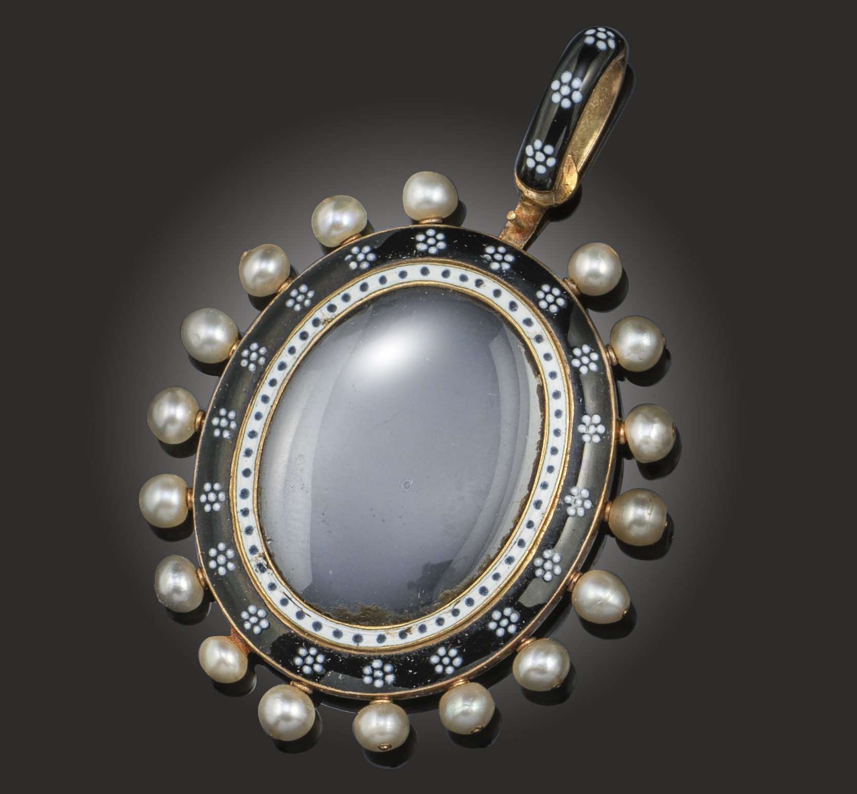 A late Victorian enamel and pearl locket pendant, circa 1879