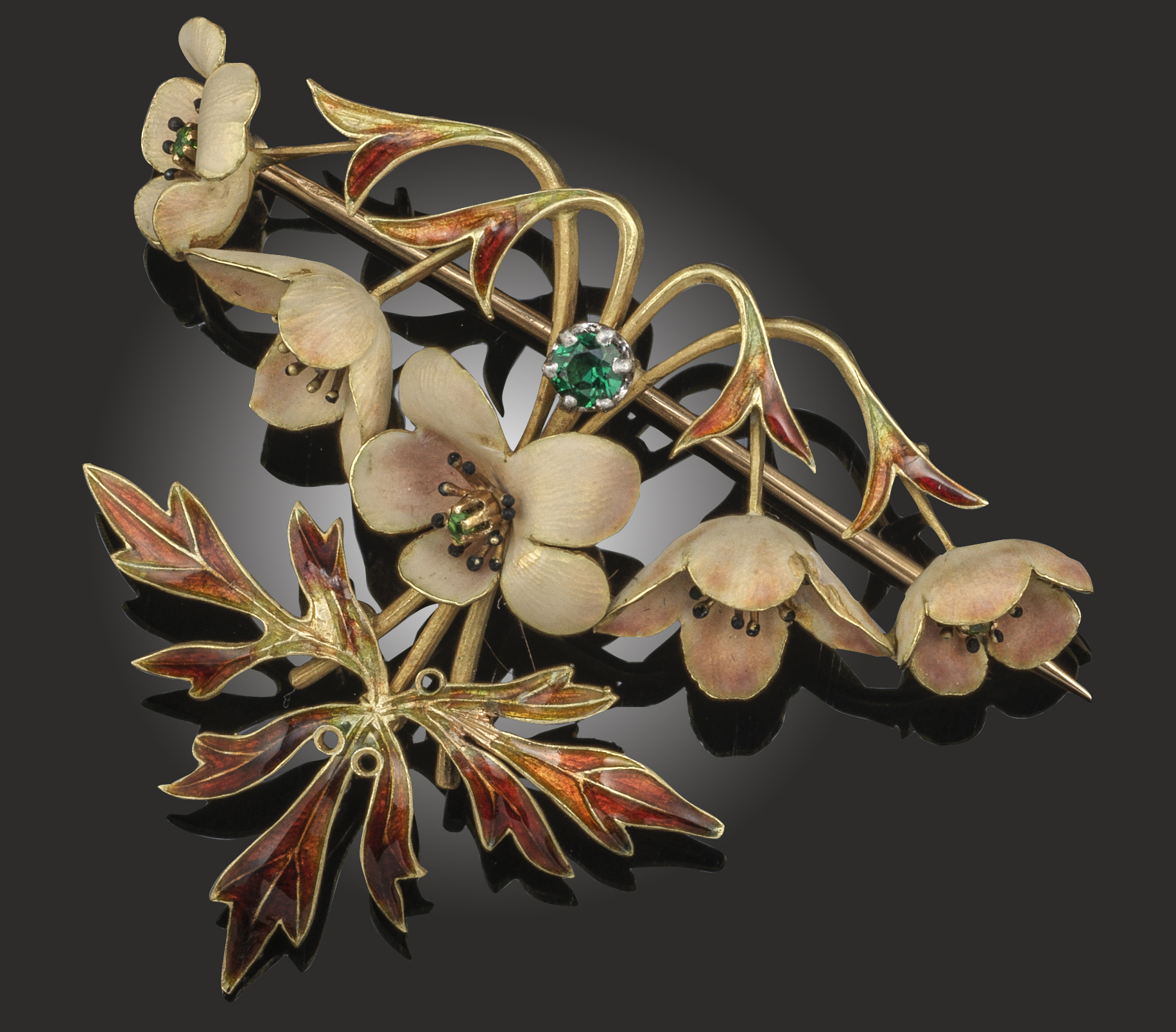 Henri Dubret, a French Art Nouveau enamel brooch pendant, depicting stylised dogwood blossom in polychrome enamel and set with a green tourmaline in yellow gold, maker's mark and French control marks for 18ct gold, detachable brooch fittings, length 5cm