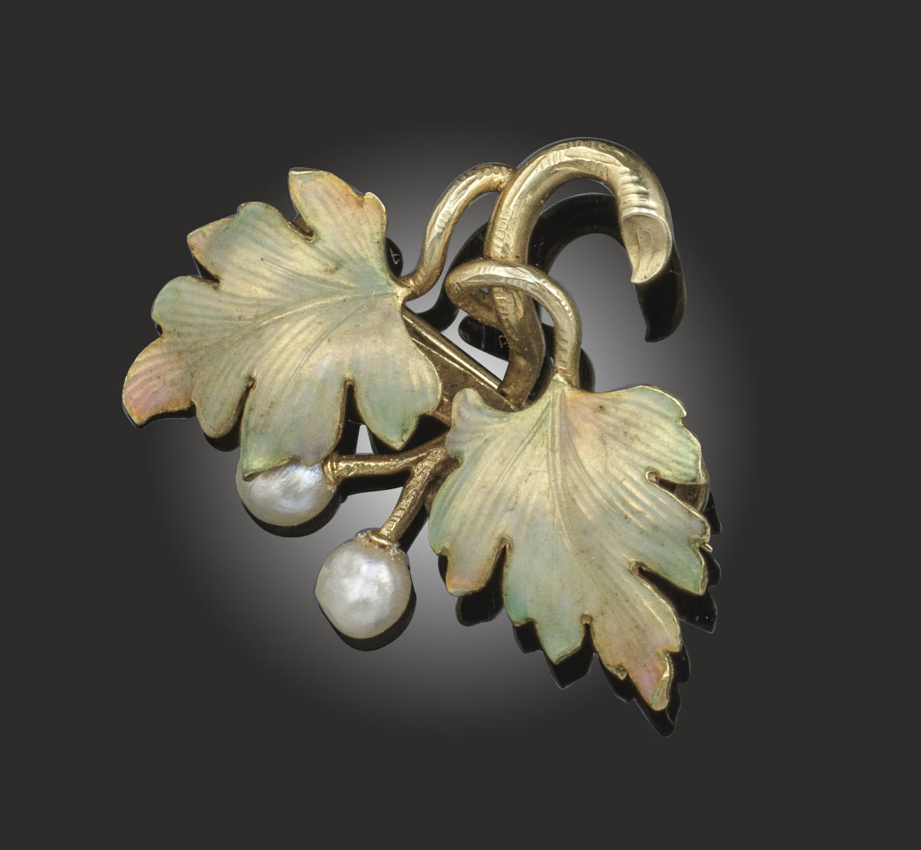 An Art Nouveau enamel and seed pearl brooch, designed as a branch of leaves decorated with irredescent shaded enamel and seed pearls on yellow gold, marked 15C to reverse, width 2.8cm