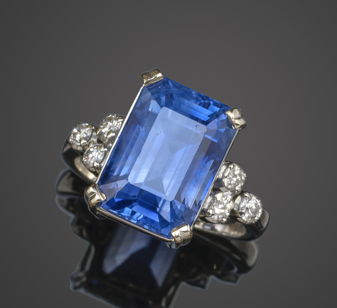 A sapphire and diamond ring, the emerald-cut sapphire weighing 14.10cts, claw set above shoulders, each set with round brilliant-cut diamonds to a white gold shank, stamped 750, size N
