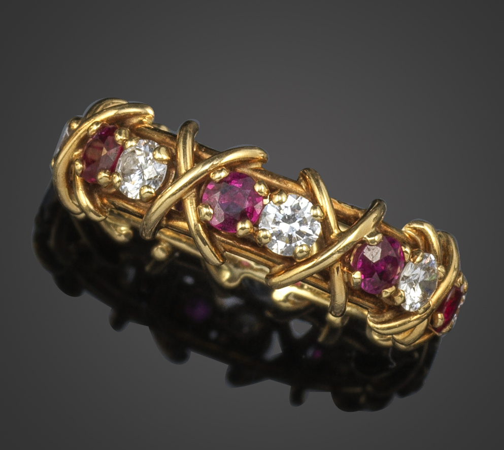 A ruby and diamond eternity ring, circa 1969, alternately-set with pairs of circular-cut rubies and diamonds separated by gold X's, London hallmarks for 18ct, 1969, size R