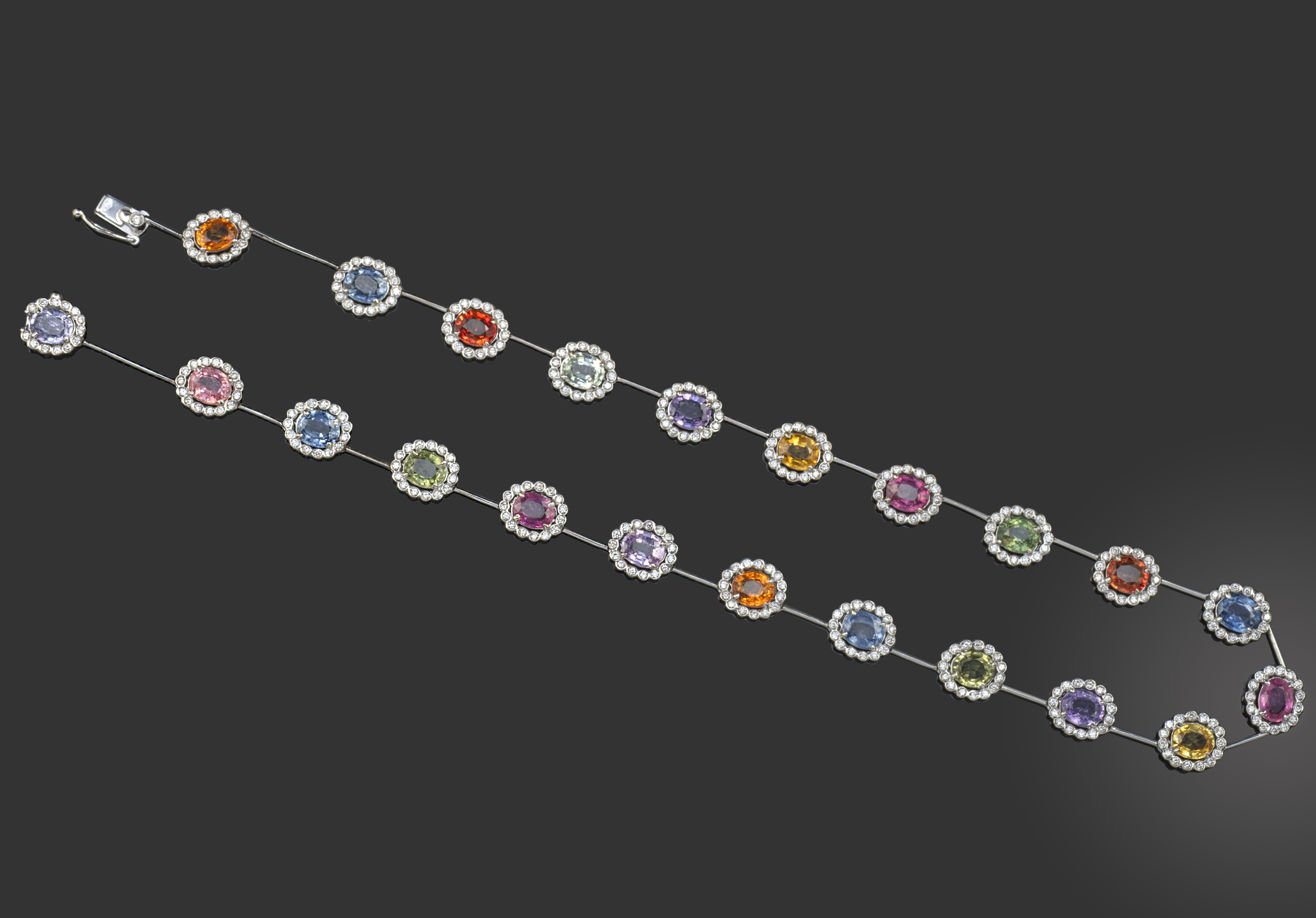 A multi-coloured sapphire necklace, designed as a series of clusters set with oval-shaped sapphires within surrounds of round brilliant-cut diamonds spaced by white gold bars, stamped 750, length 37cm