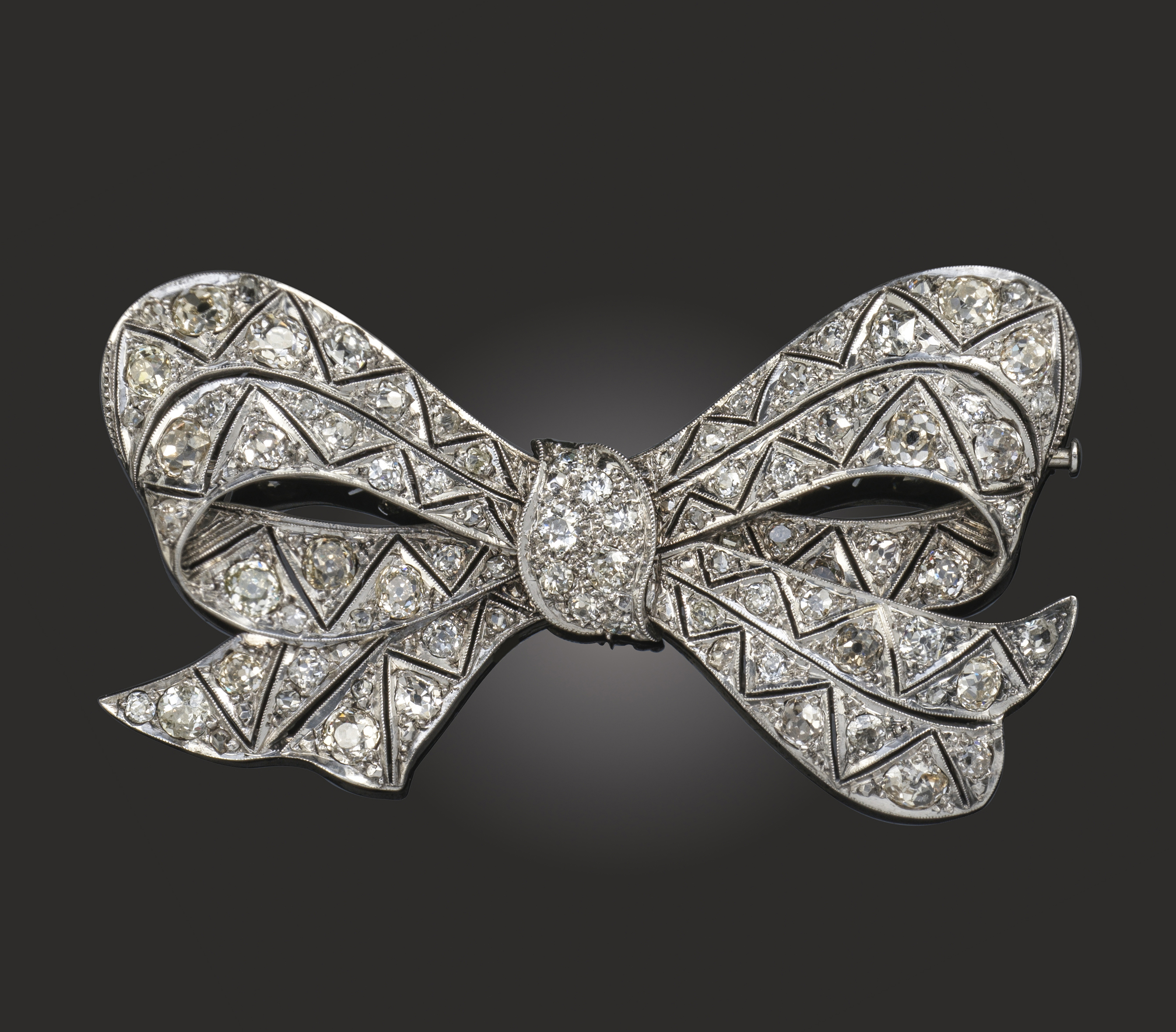 A diamond-set bow brooch, of pierced zigzag design millegrain-set with graduated old cushion-shaped diamonds in white gold, width 6.5cm