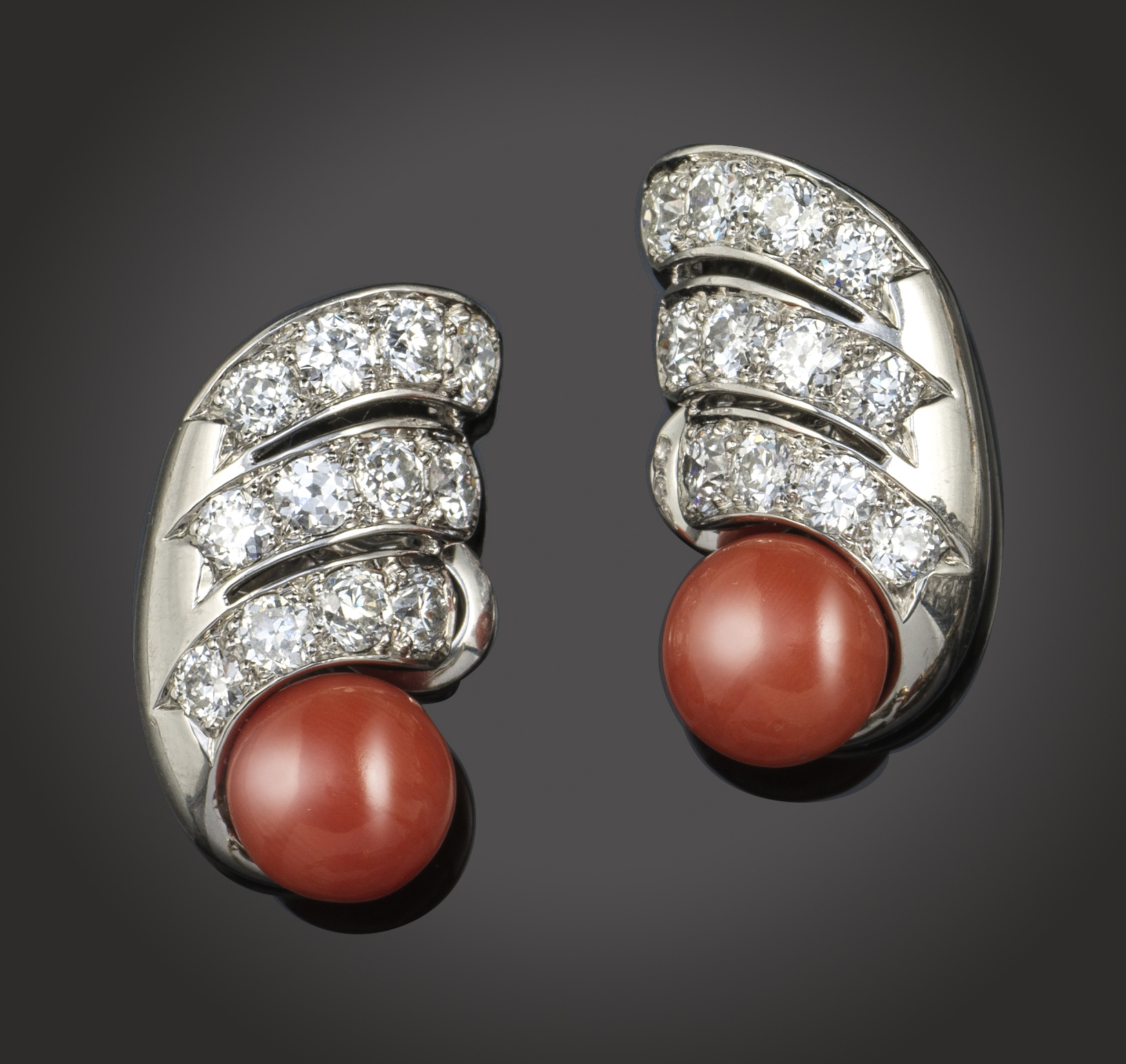 λ A pair of coral and diamond ear clips, mid 20th century, each with a circular coral cabochon below three bands of round brilliant-cut diamonds in platinum, clip fittings, length 2.8cm