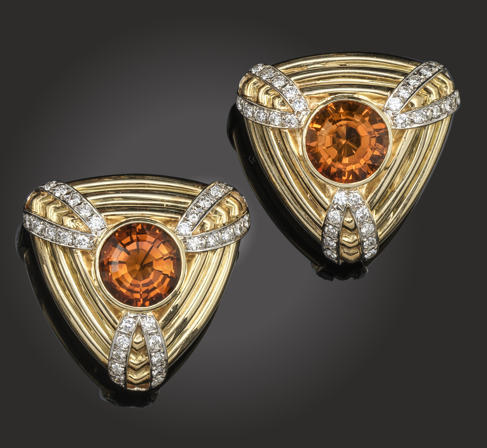 A pair of diamond and citrine-set earrings, of triangular design centring on circular-cut citrines with diamond corners in platinum and yellow gold, stamped 18k, 14k and maker's mark, clip fittings, length 2.5cm, 24g total