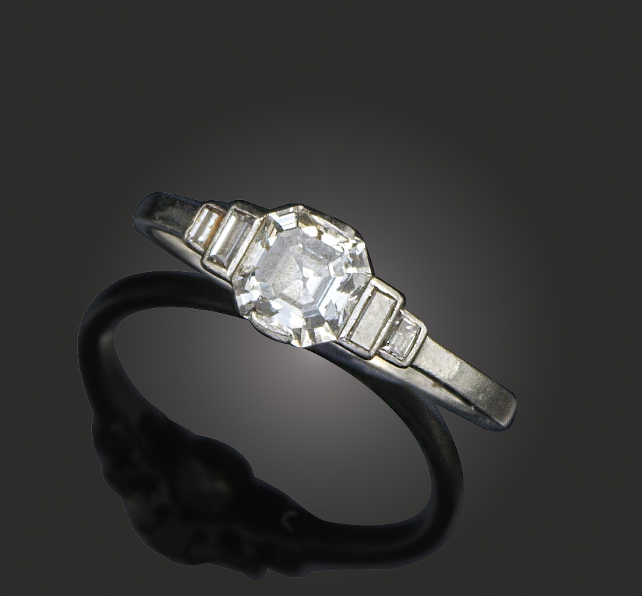 A diamond solitaire ring, the Asscher-cut diamond diamond weighing approximately 0.75cts, within baguette-shaped diamond shoulders in platinum, size L 1/2