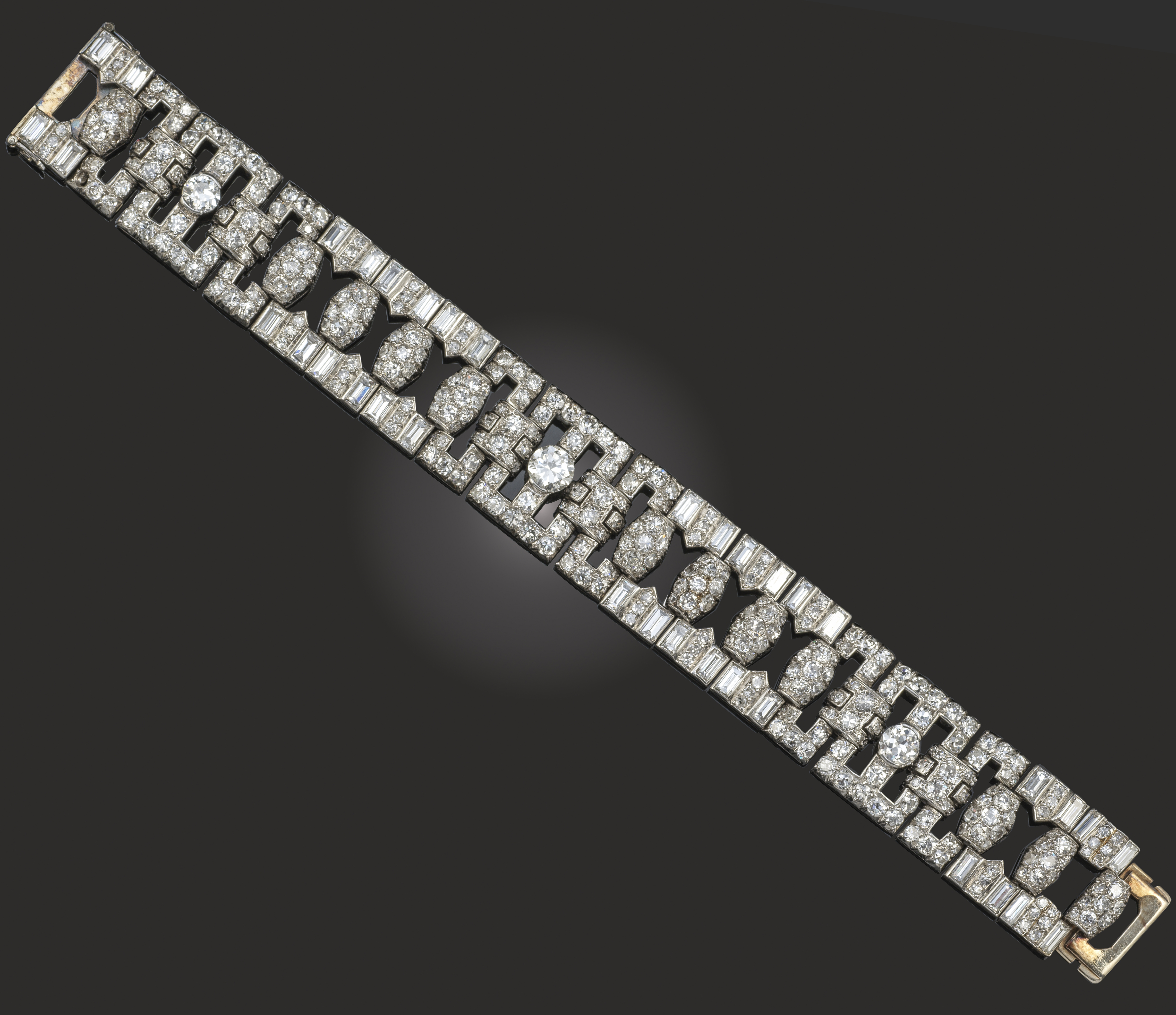 A diamond strap bracelet, the geometric links set with graduated round brilliant-cut and baguette-shaped diamonds in platinum, length 15cm