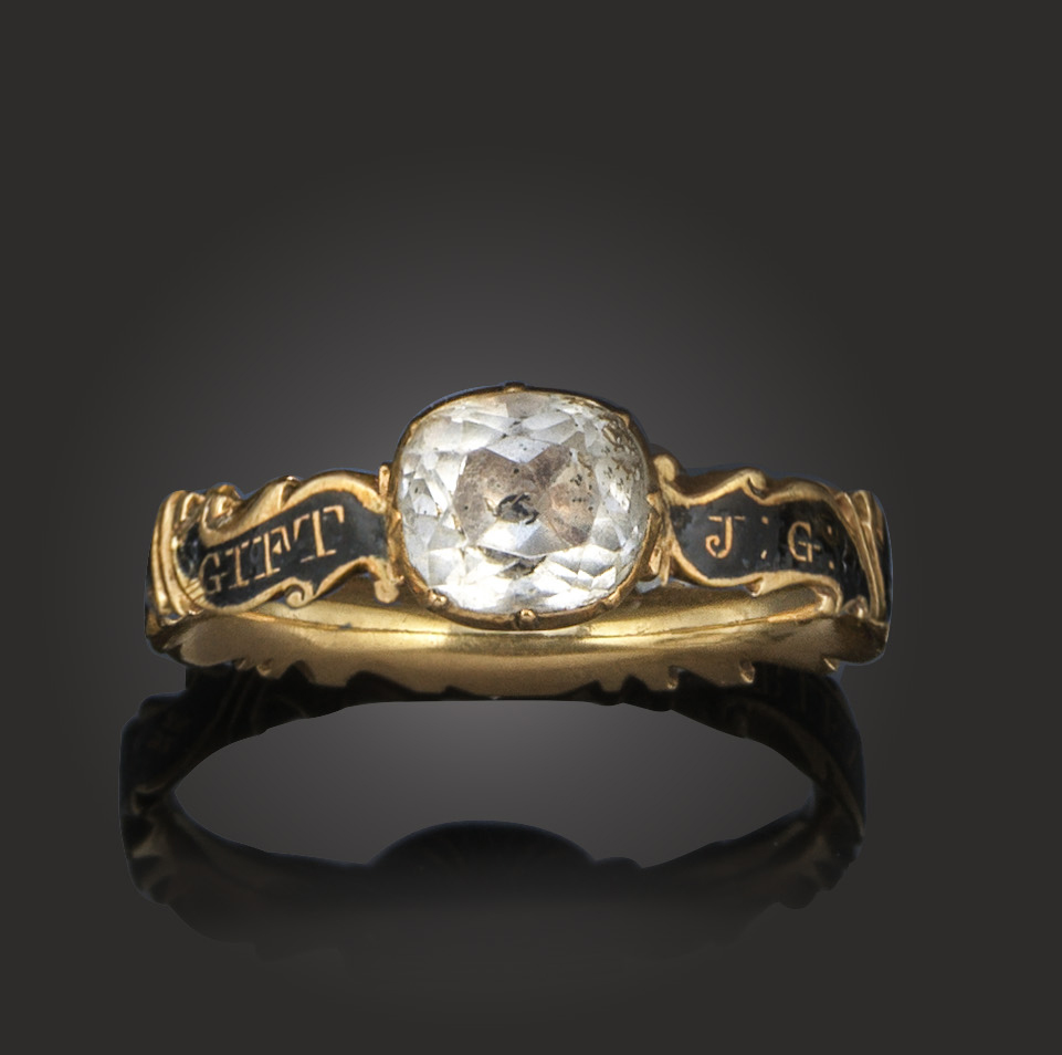 A late 18th century rock crystal memorial ring, centring on a cushion-shaped rock crystal within black enamel band with the words J.G A TRUE FRIENDS GIFT in reserve, size N 1/2