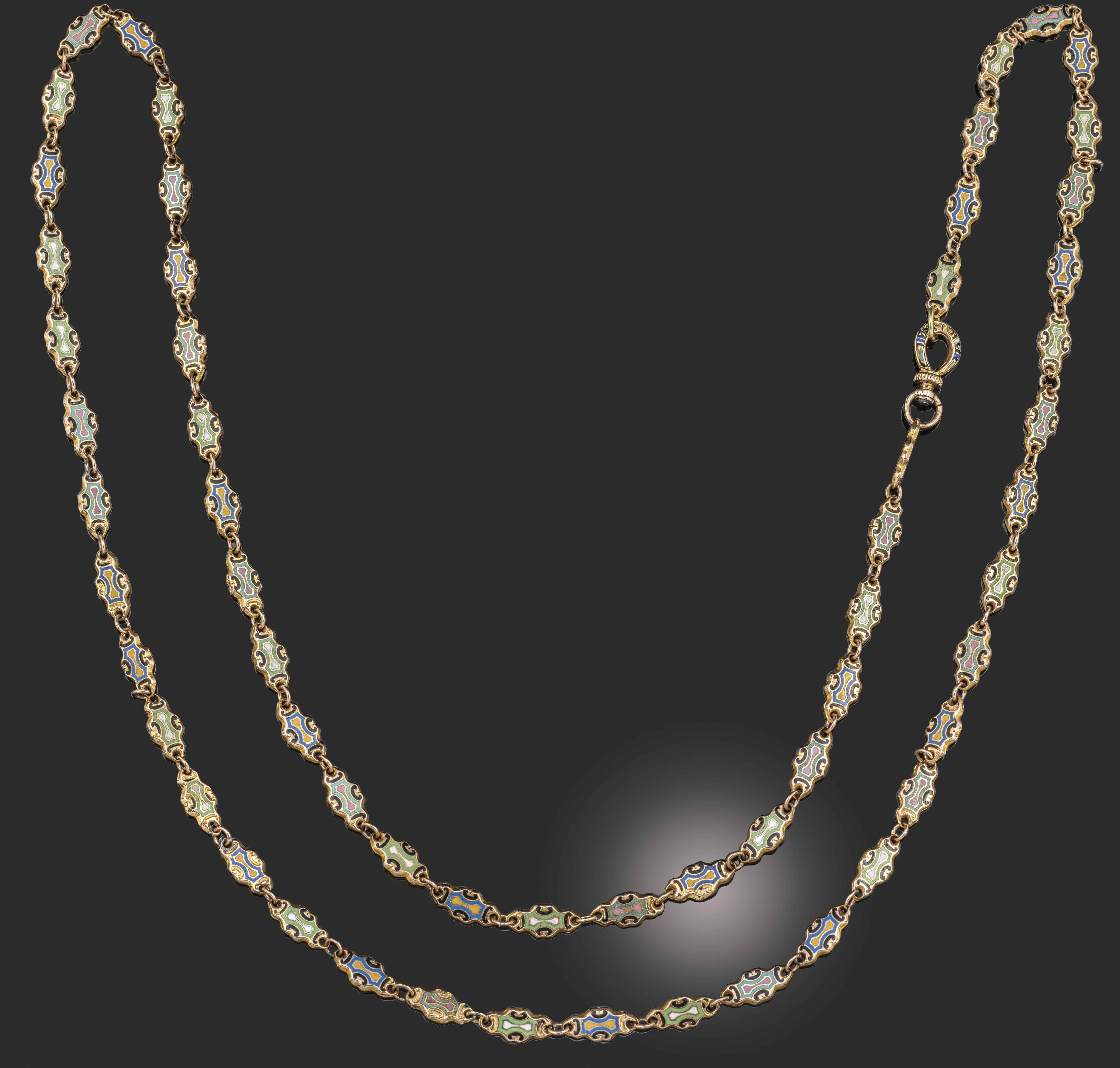 An early 19th century enamel and gold long chain, the cartouche-shaped links decorated with C-scrolls heightened with multi-coloured enamel, gross weight 15g, length 76.5cm