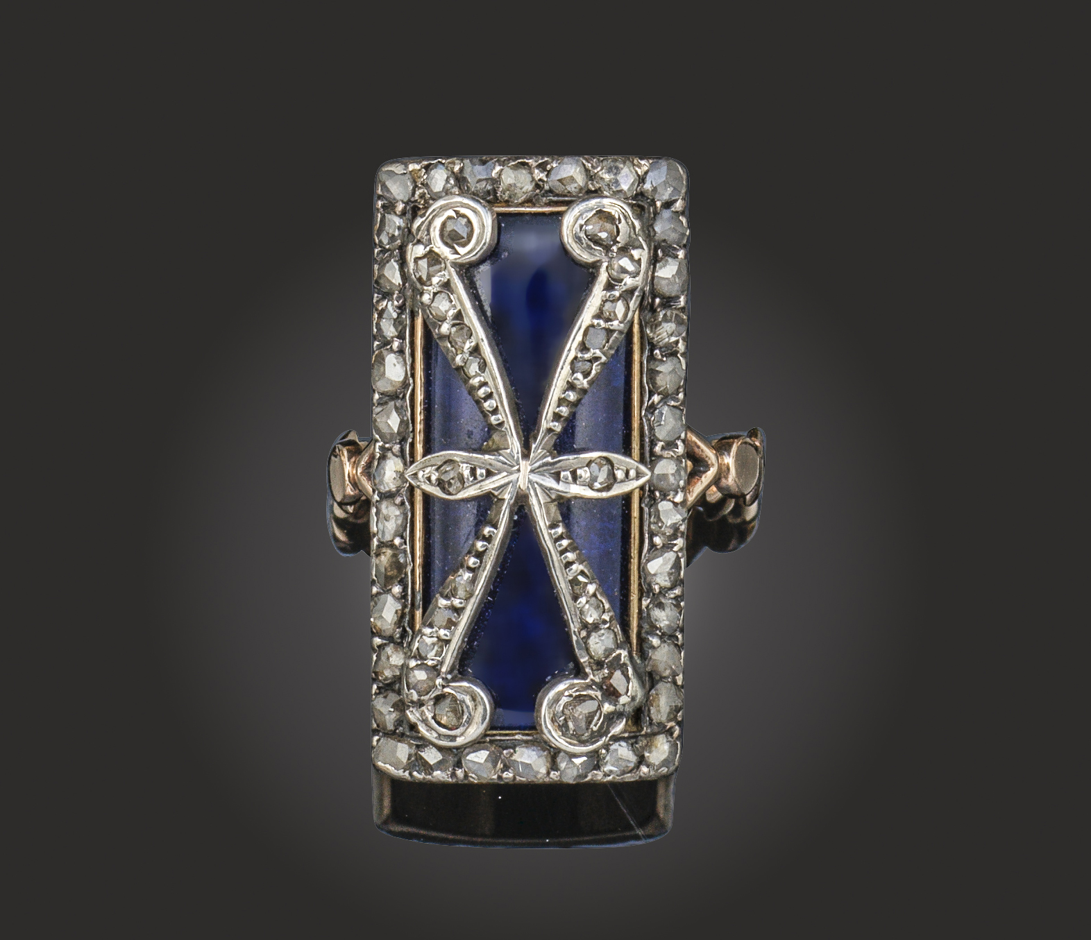 A late 18th century curved rectangular form ring, set with rose-cut diamonds to the border and scroll design on blue glass ground, engraved with roses to reverse, size K