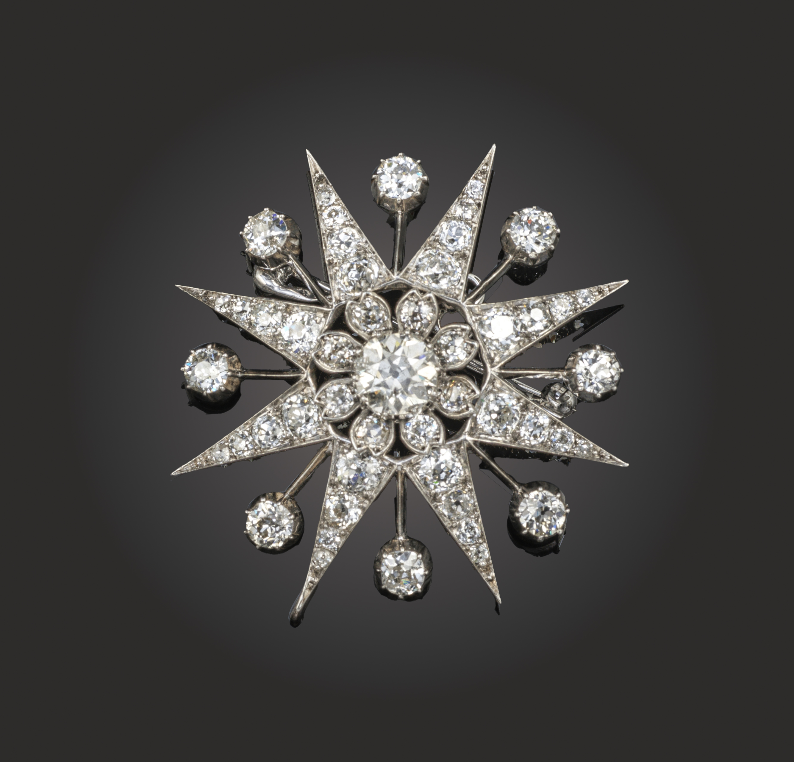 A Victorian diamond star brooch pendant, late 19th century, the eight rays alternating with individual collet-set diamonds and centred with an old circular-cut diamond weighing approximately 2.10cts, within a floral frame, all set with old circular-cut diamonds and mounted in silver and gold with later rhodium plating, detachable brooch fitting and pendant loop, length 5cm