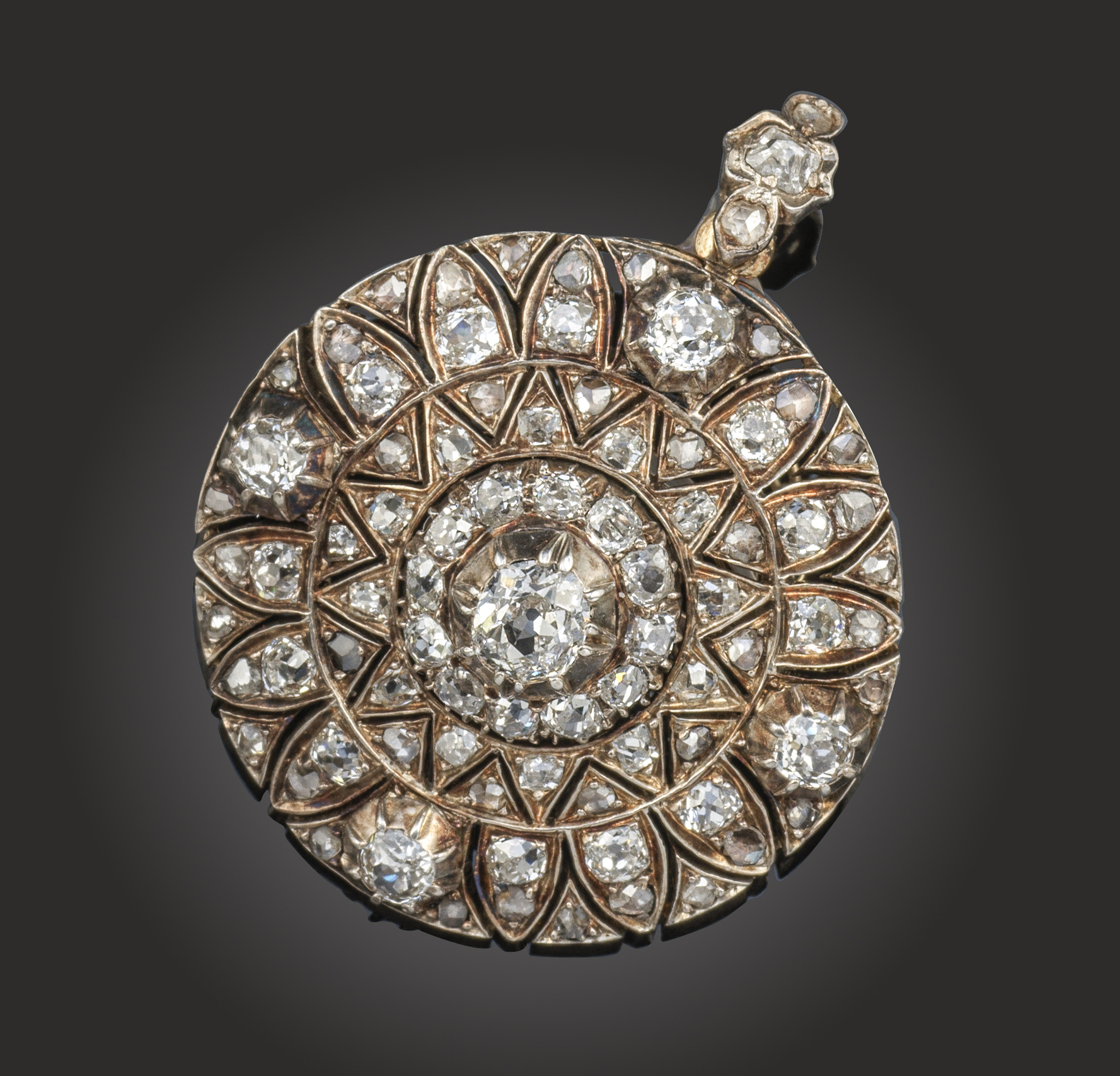 A late Victorian diamond brooch, circa 1890, of target design, centered with an old cushion-cut diamond within a geometric openwork surround set with rose-cut and circular-cut diamonds and four old cushion-cut diamonds to the outer register, mounted in silver and gold with a detachable bail and brooch fitting, diameter 3.2cm, case