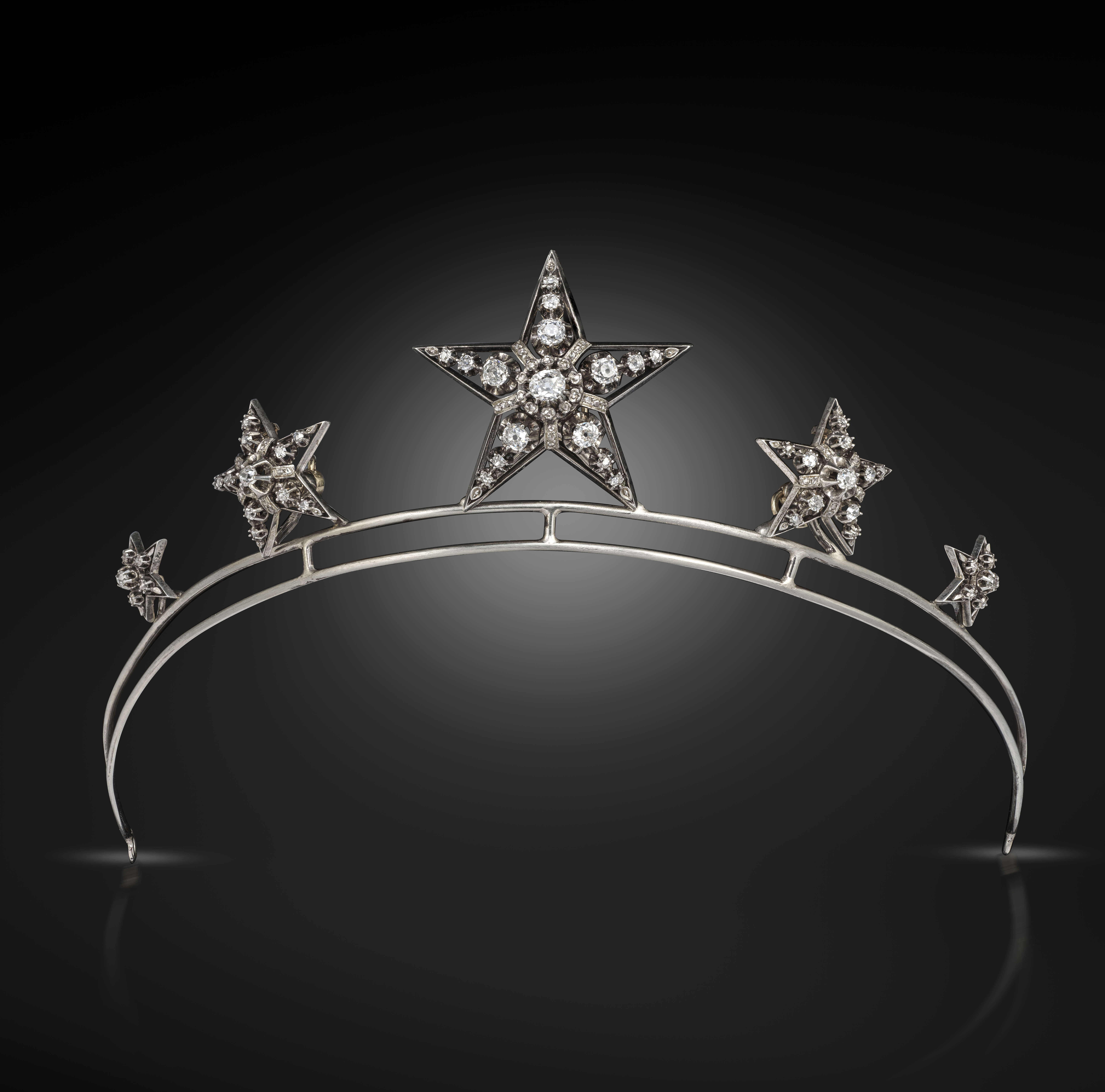 A diamond-set star tiara, late 19th century and later, designed as a band of graduted 19th century stars set with old circular-cut and cushion-cut diamonds, mounted in silver on gold, the central three stars detachable and converting to pendants, on a later silver tiara frame, tiara inner curve 28cm, height at centre 5.4cm, central star length 4.5cm