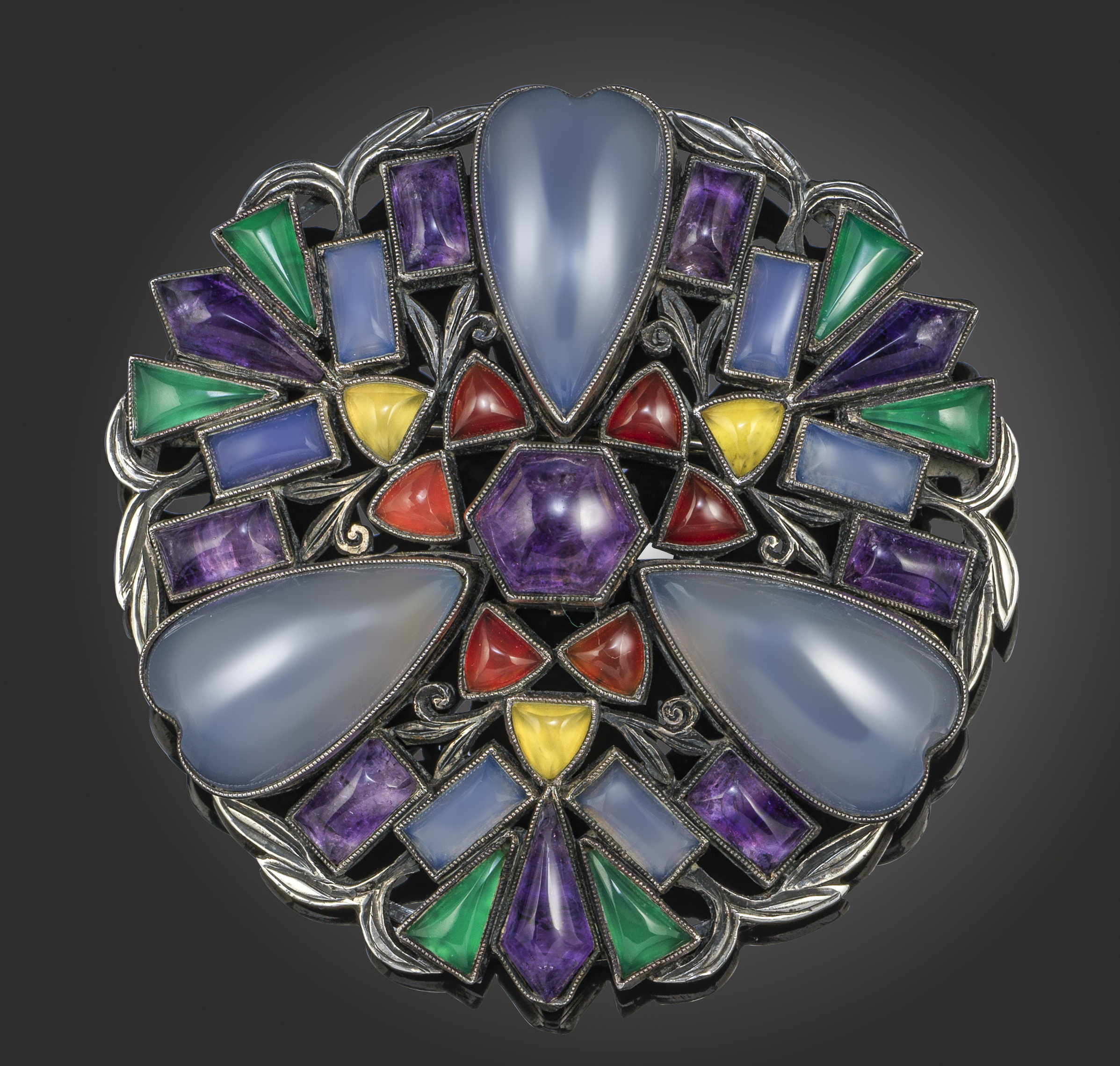 Sibyl Dunlop, an Arts & Crafts multi-gem brooch, circa 1965, in the 'carpet of gems' design, set with amethyst, chrysoprase, carnelian and chalcedony, the geometric cabochons in a repeating pattern around three large heart-shaped blue chalcedony cabochons, set in an openwork foliate silver frame, signed S DUNLOP, London hallmarks, date letter for 1965, diameter 5.6cm