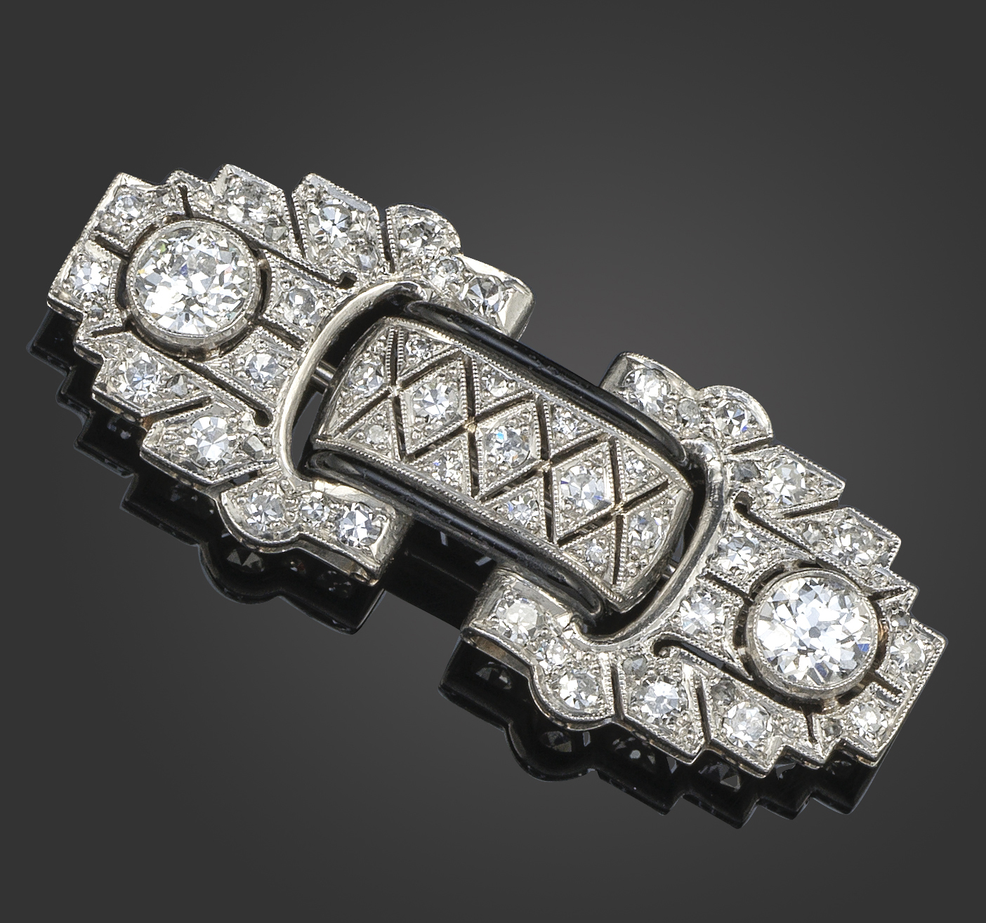 An Art Deco onyx and diamond brooch, of geometric design, formed of two panels each set with an old circular-cut diamond millegrain-set within pierced diamond surround, conjoined by an onyx and diamond panel in platinum, length 4.1cm