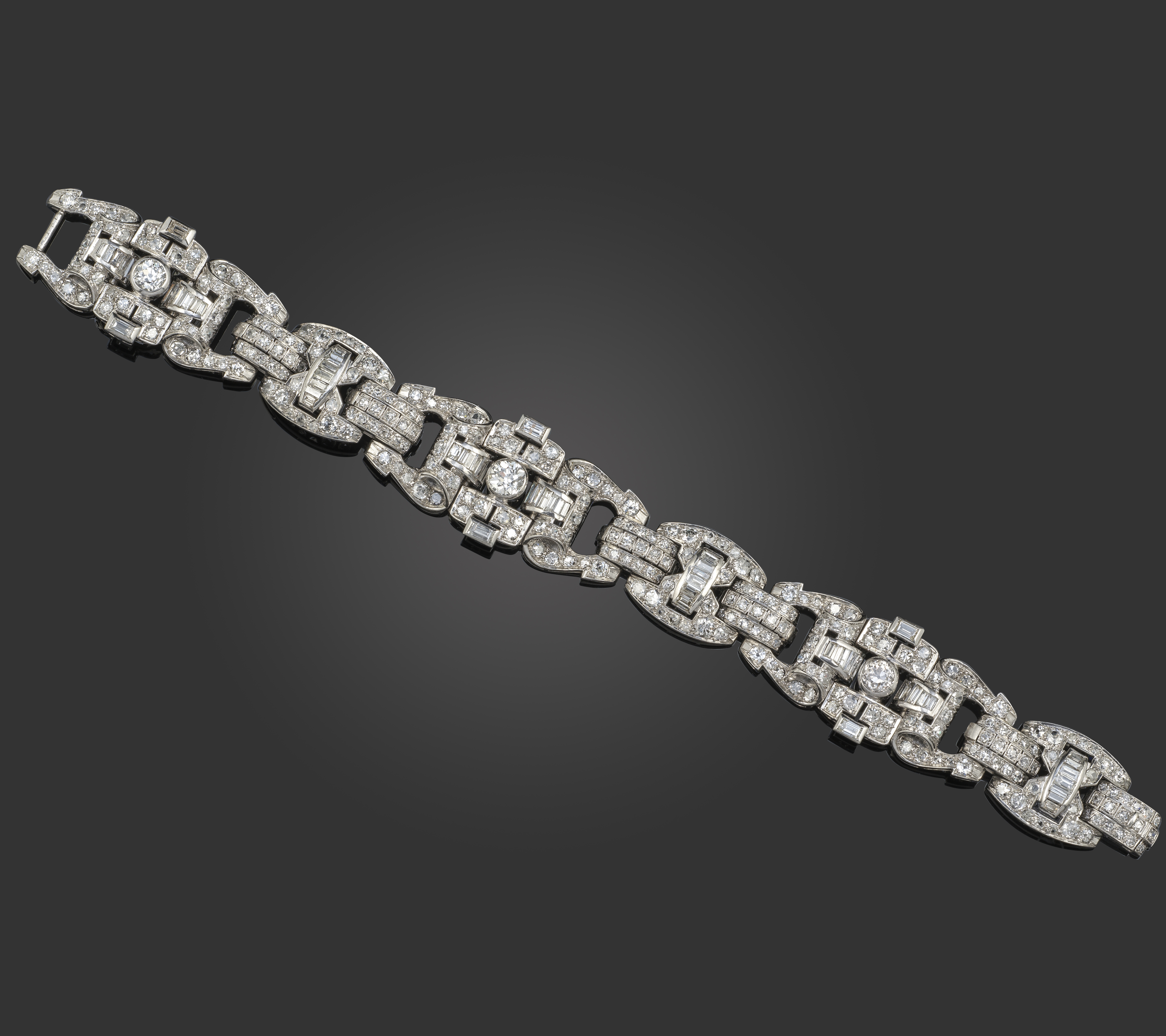 An Art Deco diamond-set platinum bracelet, set with graduated circular-cut and baguette shaped diamonds to the geometric links, stamped La Cloche and numbered 5088, 18.5cm
