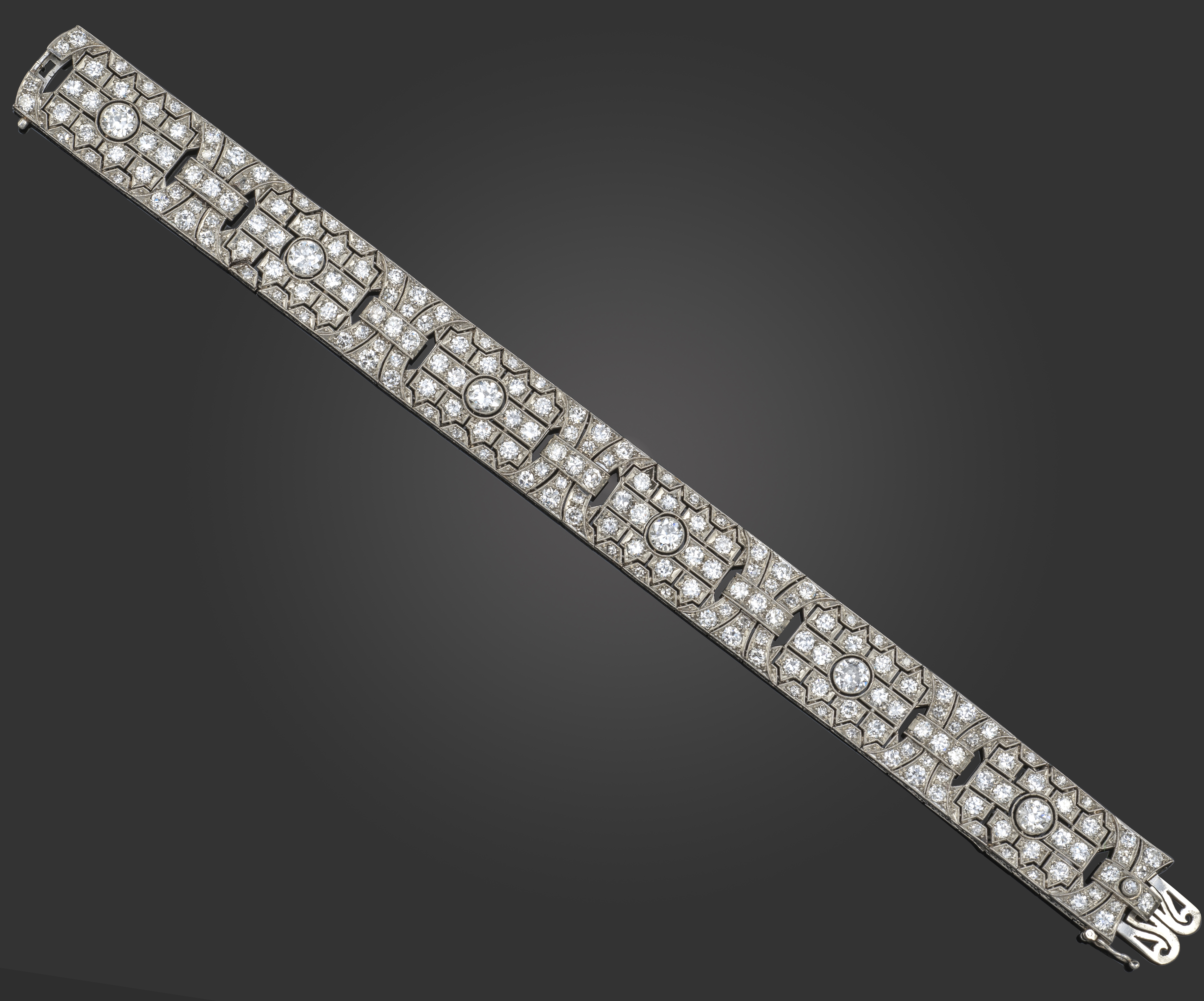 A diamond strap bracelet, of pierced openwork geometric design millegrain-set with graduated round brilliant-cut diamonds in platinum, length 18cm
