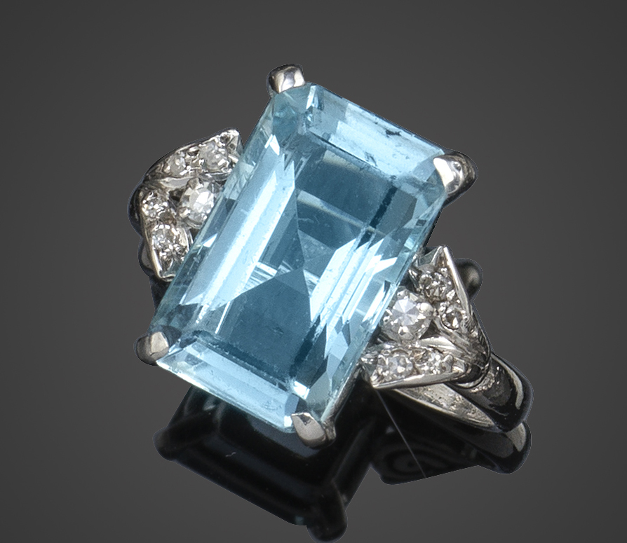 An aquamarine and diamond ring, the step-cut aquamarine claw-set above foliate shoulders accented with diamonds in white gold, stamped 750, numbered AA 17518, size K 1/2