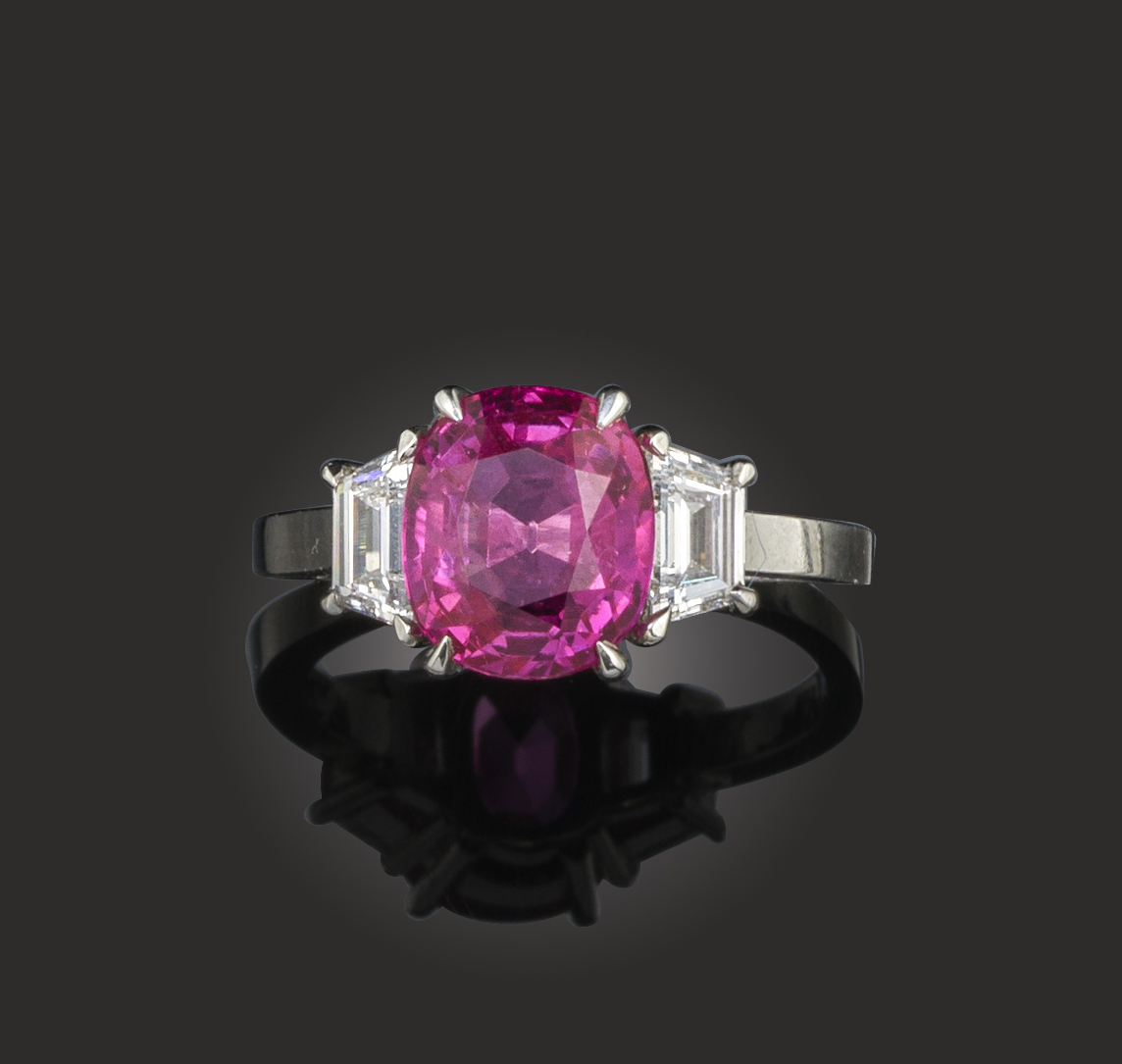 A ruby and diamond three-stone ring, the cushion-shaped ruby weighing 3.106cts, between two tapering baguette-shaped diamonds in platinum, London hallmarks, date letter for 2023, size K 1/2
